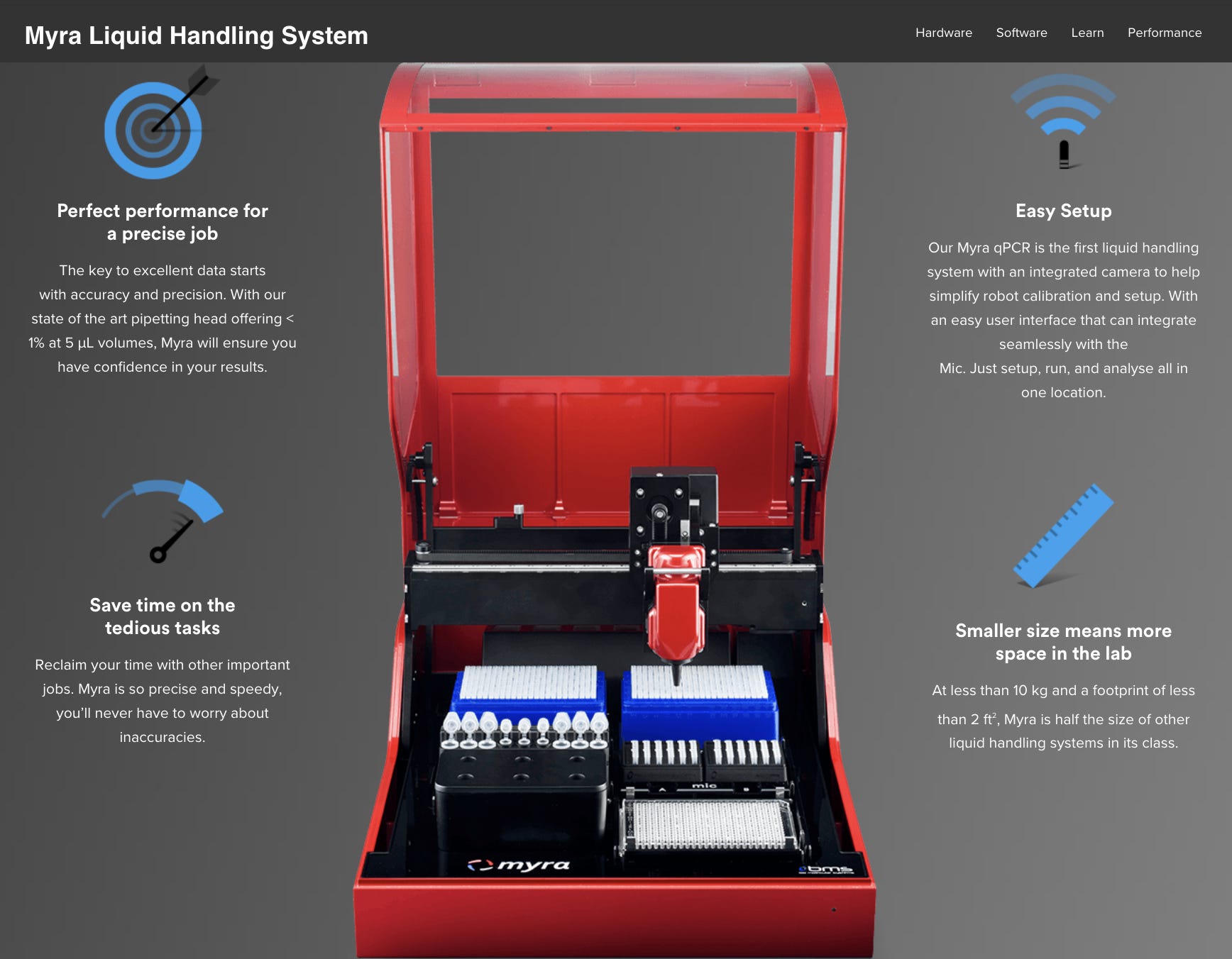 It has an optional liquid handling robot (Myra) that sets up all the PCRs into their low volume tubes. This affords robust 10ul reactions and we’ve even seen 6ul reactions perform as well. This is an important aspect of qPCR as the human setup of the reaction is where it is most prone to contamination.