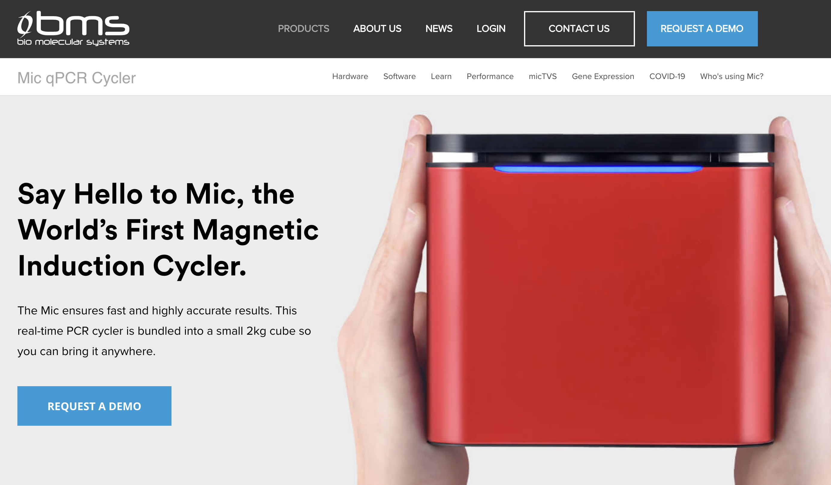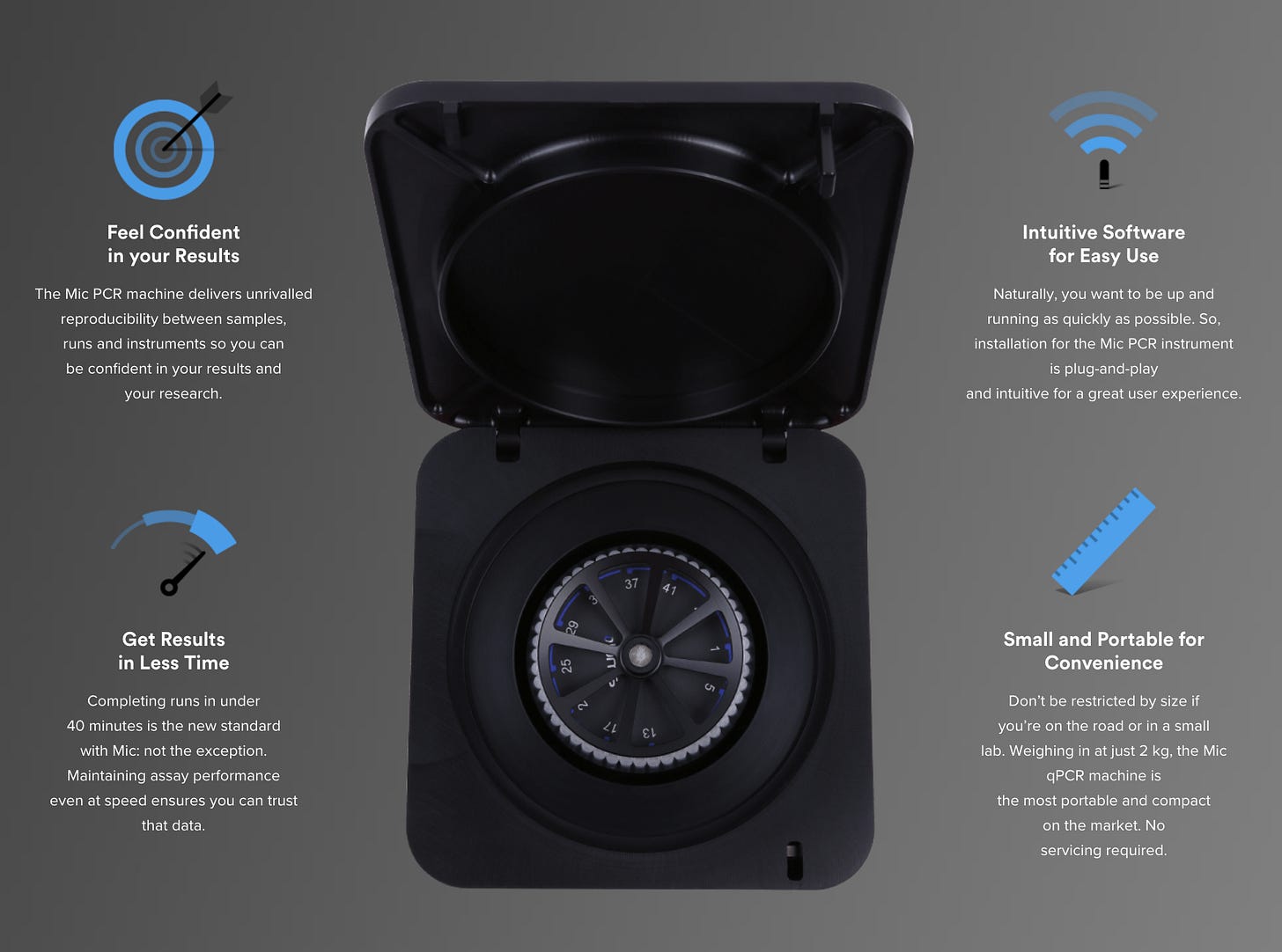One of our favorites is the BMS Mic/Myra system. This system uses magnetic induction for heating and cooling and a centrifugal detection system. This detection system is light weight and can be used on the international space station as zero gravity and traditional PCR detection methods are not friends. The fluid in traditional qPCR systems does not stay in wells when you heat and cool it in zero gravity. Centrifugal detection can run with the instrument upside down.