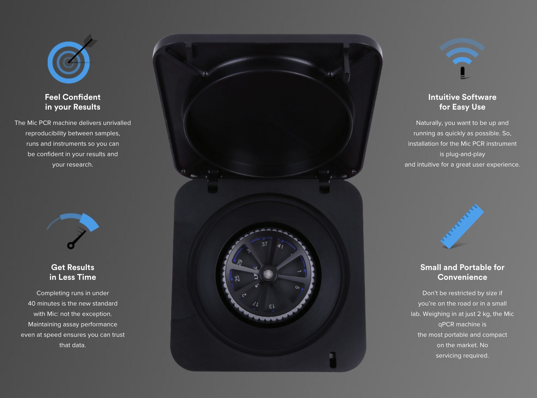 Because of its low volume and magnetic induction, it can ramp temperatures faster than traditional Peltier block cyclers such that 35 cycles can be recorded in 25 minutes. Two of these detection Cubes (Mics) can be daisy chained to a robot and flip around 48 tests every 25 minutes.