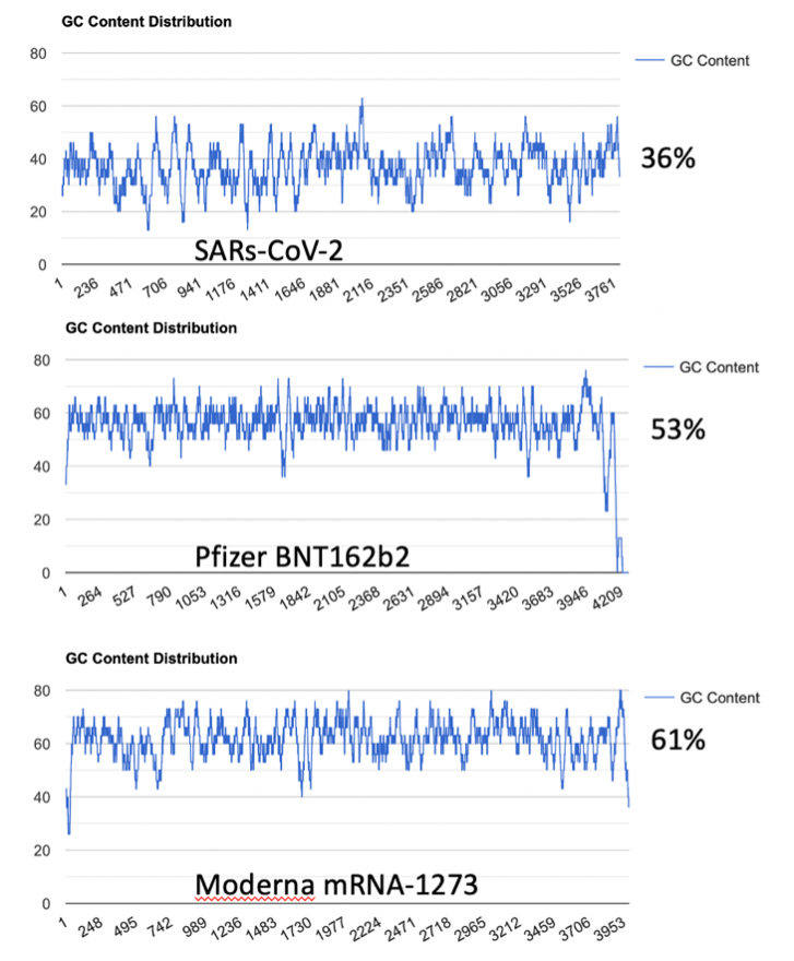 To address the implied equivalency of virus derived spike protein vs mRNA derived spike protein, we explore the impact of codon optimization on the secondary structure of the natural RNA encoded spike protein and compare this to the secondary structure of the mRNA vaccines. The most obvious alteration from codon optimization is the increase in the GC content of the mRNAs (Figure 1.)