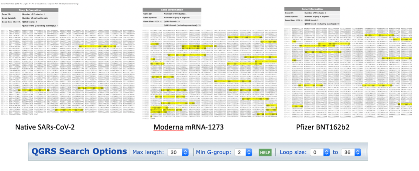Not only are the secondary structures of the mRNA noticeably different, of note, is the increased number of quadruplex G formations in the codon optimized mRNA vaccines (Figure 3). Quadruplex G formations (G4s) in SARs-CoV-2 are highly conserved across over 16,466 SARs-CoV-2 genome sequences 9. They are believed to play a critical role in transcriptionand translation of SARs-CoV-2 peptides 10-12. G4 formations in the RNA sequence for nucleocapsid protein have been proposed as attractive drug targets to eliminate nucleocapsid expression. This is achieved by using compounds that stabilize quadruplex G formations 13.
