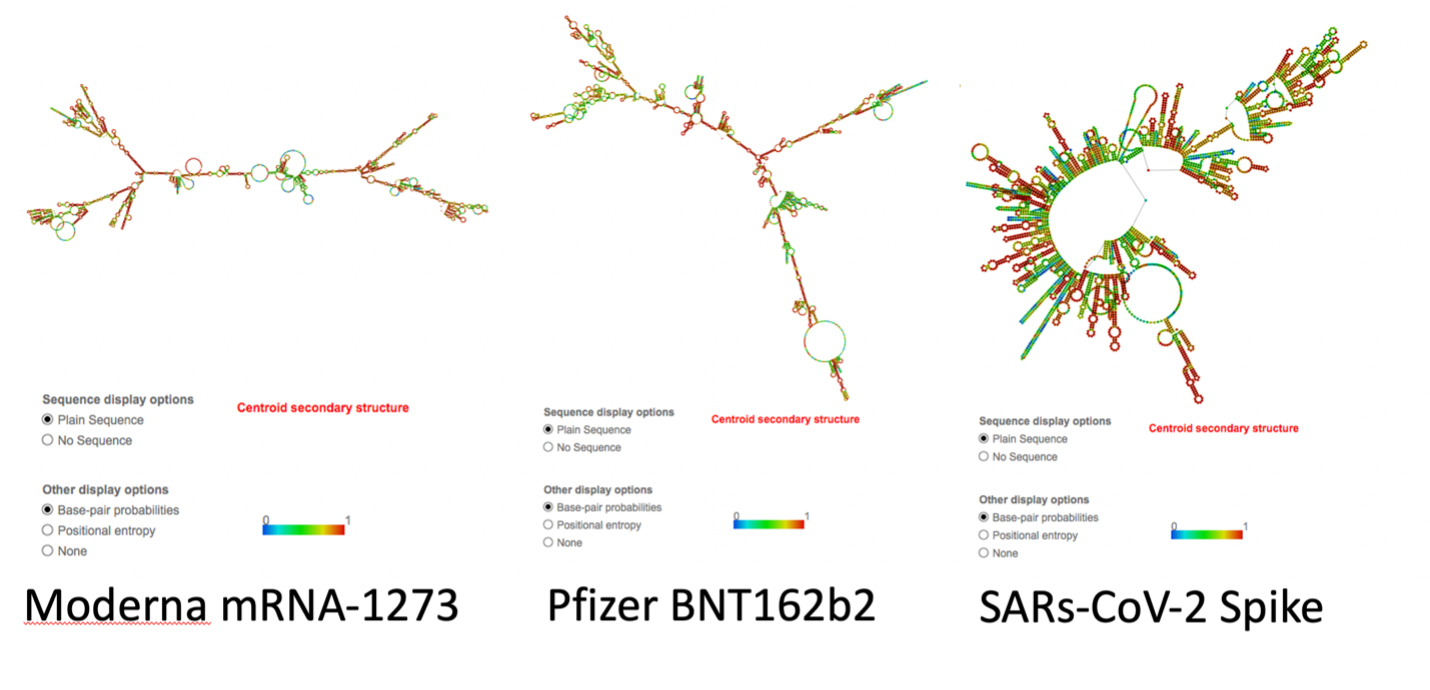 This increased GC content significantly alters mRNA secondary structure. Using RNAfold (http://rna.tbi.univie.ac.at/cgi-bin/RNAWebSuite/RNAfold.cgi) we see the changes to secondary structure in the vaccine derived mRNAs compared to the native virus (Figure 2)4. This is a result of codon optimization that was likely performed without the consideration of secondary structures like quadruplex G formation.