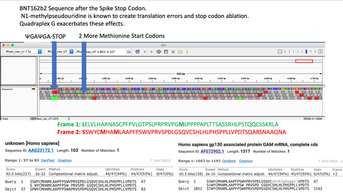 How much m1Ψ is present in these mRNAs? The only independent DNA sequence released for these mRNA vaccines were sequenced on Illumina platforms that are blind to pseudouridine 35. The exact m1Ψ density (while reported by the manufacturers to be 100%) has not been independently sequence verified. The most parsimonious synthesis approach described by Nance et al. replaces all uracil’s with m1Ψ via polymerase incorporation 18. Such an approach would also leave the stop codons prone to pseudouracil stop codon read through described by Fernandez et al. 36. Pseudouridine is also known to create ribosomal frameshifts. Penultimate to the ΨGA ΨGA stop codon in the BNT162b2 vaccine is an out of frame human amino acid sequence of unknown function (AAG23172.1) (Figure 4). Xia et al. also makes note that UGA stop codons are more prone to read through and +1 frameshifts suggesting these mRNA derived stop codons may not be as effective as viral derived stop codons 15.