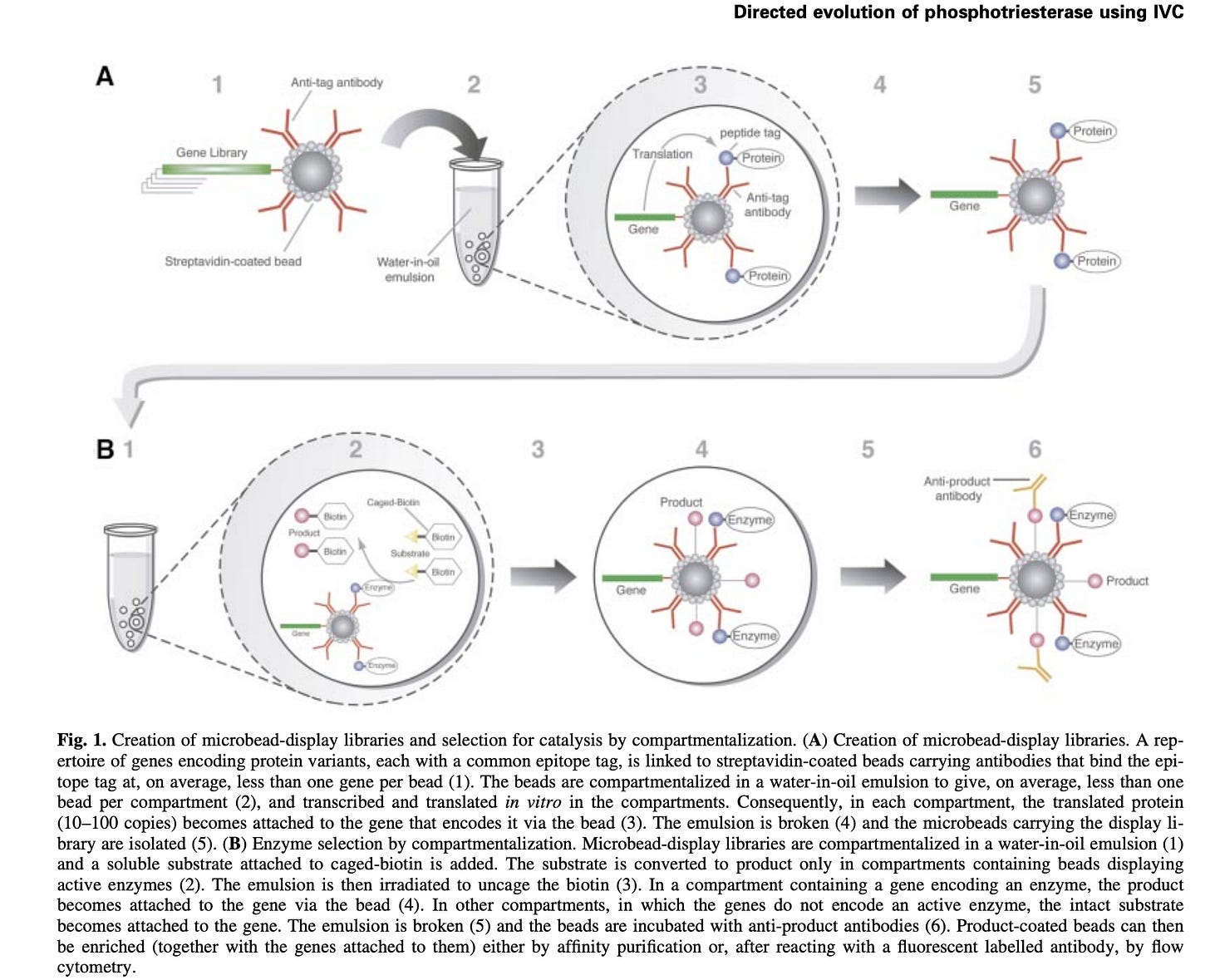For this, you need to understand some seminal work in the directed evolution field from Tawfik and Griffiths. These chaps brilliantly leveraged emulsion PCR to become an emulsion Transcription and Translation workhorse. We call this TnT or in vitro Transcription and Translation. This is akin to making synthetic cells (massively parallel compartmentalization) that have Darwin inside. All of the ingredients to copy DNA with a little mutagensis, turn it into proteins, and create feedback loops where the protein products alter the DNA in a desired direction which maximizes protein performance. The most replicated bubbles are your most evolved DNA sequences for the given selection you designed.