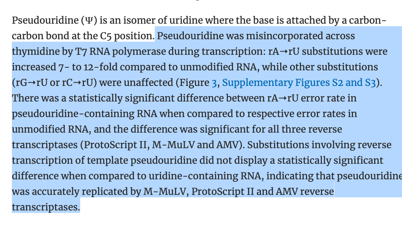This is an important point. You will notice a recent Nerf paper on Pseudouridine that I critiqued for using Reverse Transcriptase assays. If you are trying to hide Pseudouridine issues, Reverse transcriptase are a good way to do it. But these turn RNA into DNA and are not used in the manufacturing of RNA templates from DNA plasmids. In other words, the model isn’t relevant for the methods used to make mRNA vaccines.