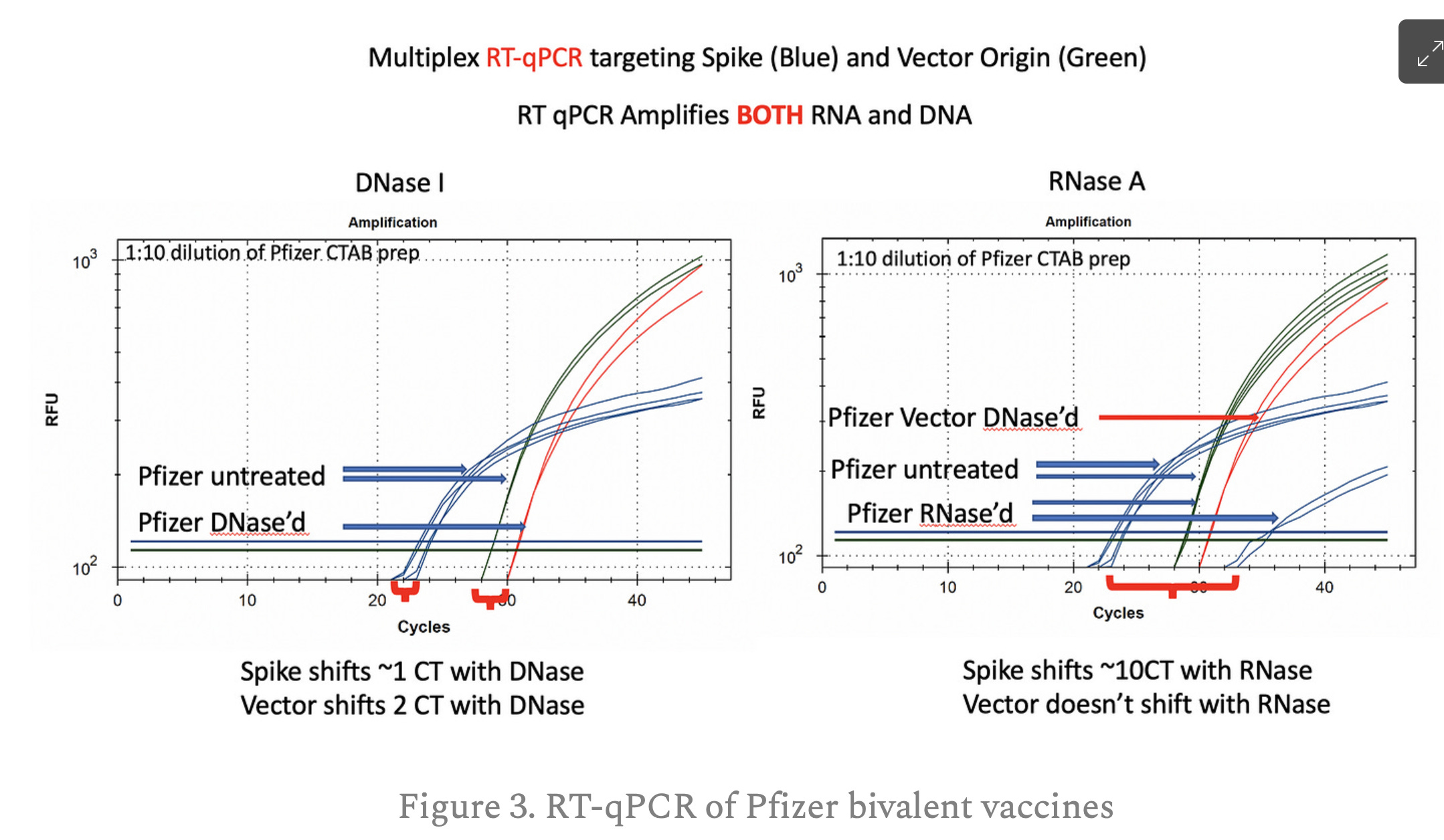 Replicated from our previous study on the bivalent vaccines. These results in Figure 3 (on the left DNase I ) chart were generated using a different DNA prep and dilution than the boil prep used in this study. They were also from vials that did not have any dilution instructions so the CTs are delayed compared to the monovalent vaccines as expected. The CT offset on the DNase I chart (on the left ) with the Pfizer untreated Spike (blue) and Origin (green) appears to be about 5-7 CTs.