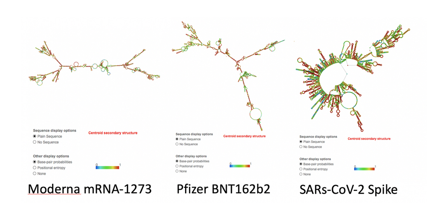 The exhaustive replacement of U with N-1-methyl-psuedo-U and excessive GC optimisation was done with the singular myopic desire to hoodwink our cell biology and max out protein translation. Concerns raised by McKernan, Kyriakopoulos and McCullough in their pre-print https://osf.io/bcsa6/ highlighted a host of problems with this approach. Sixteen months later and backed by solid experimental science, we find out the s**t show just got a whole lot worse. The lack of foresight, consequence of action and hubris by Pfizer and Moderna is unbelievable.