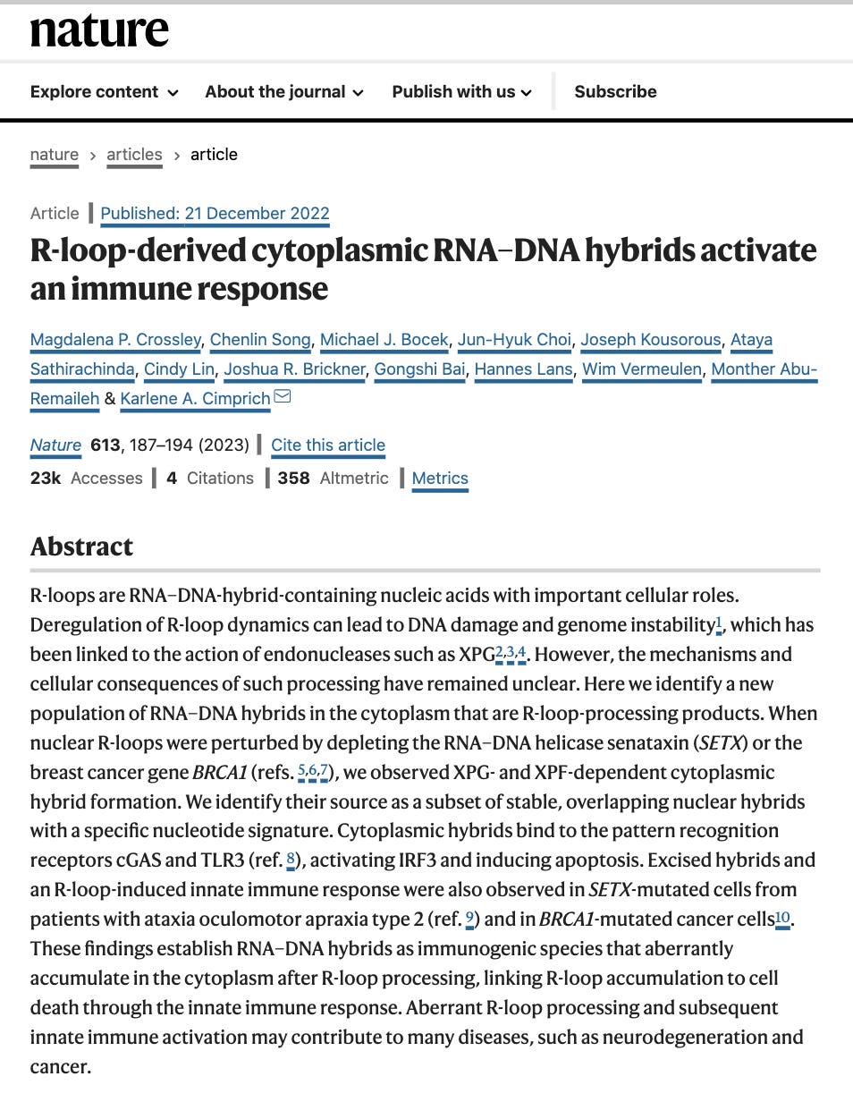 David Wiseman asked a pertinent question. “If your lab nucleases are confused by this, what happens in a mammalian cell transfected with these?” Good question. This brings us to Crossley et al. that demonstrate RNA-DNA hybrids active immune responses and trigger a host of other pathways.