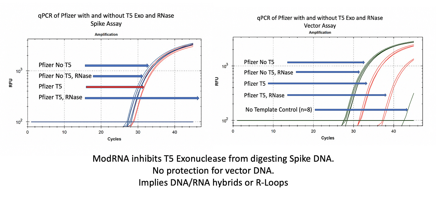 The literature on m1Ψ’s impact on Tm (melting temp) implies m1Ψ is a very ‘sticky’ base and likely forms strongly bound DNA-RNA hybrids and R-Loops that are nuclease resistant. This may explains why the plasmid DNA has been difficult to remove from the vaccines. This also brings into question what SYBR dyes do in the presence of DNA/RNA hybrids and if we’re in new territory trying to quantitate the DNA content in these vaccines. We mentioned this in our Preprint as a potential limitation to the Fluorometer based measurements.