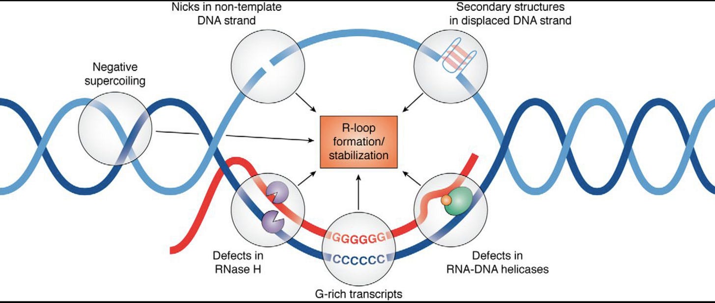 Keep in mind your cells are processing R-Loop all the time. Every gene that gets expressed generates these, however these modRNAs are not ordinary genes. As we have shown, they stall nucleases, they are quadruplex G dense and the 801 m1Ψs is not something the cell has ever seen before. m1Ψ is usually at 0.2-0.6% in human mRNA. The vaccine mRNA is 100% m1Ψ.