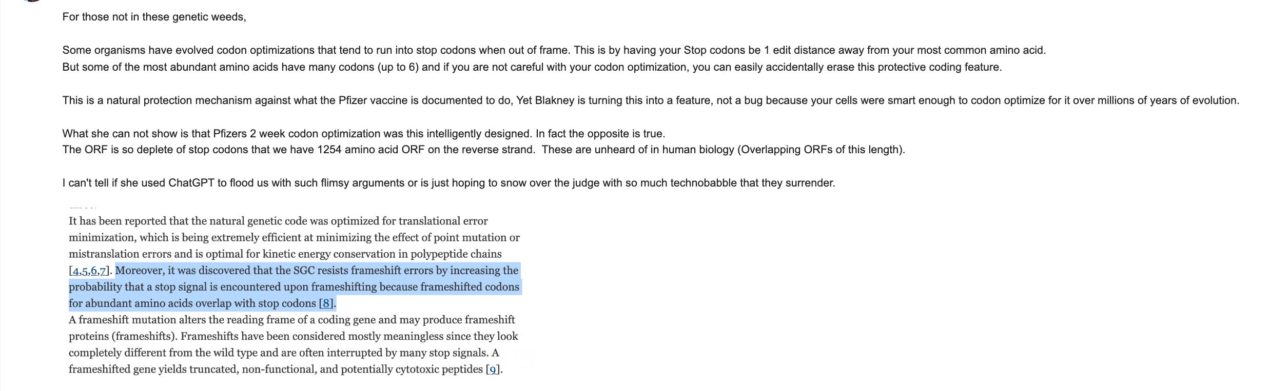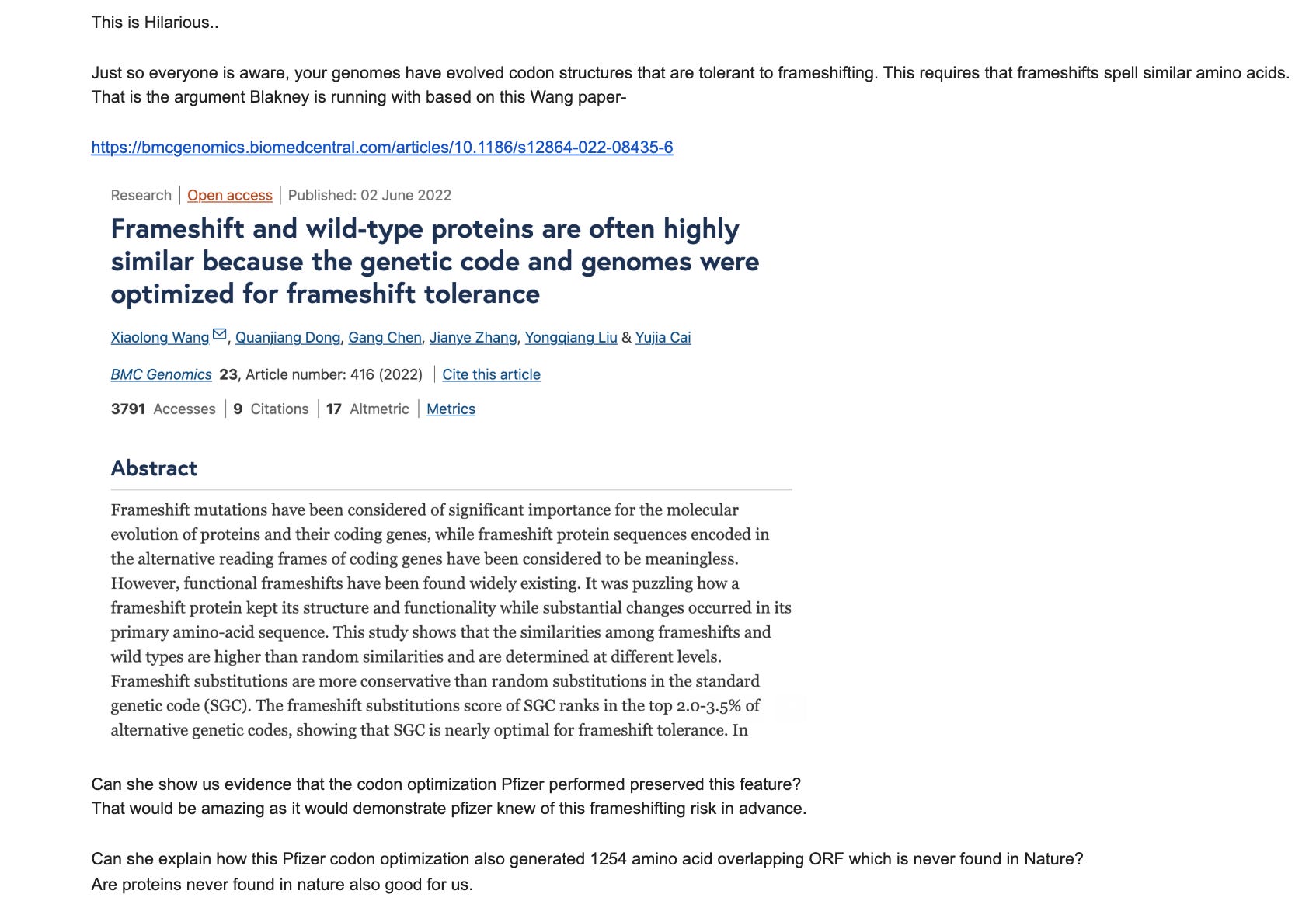 Anne Blakney then proceeded to make a ridiculous argument suggesting your genome has evolved to handle frameshifts by citing Wang et al.