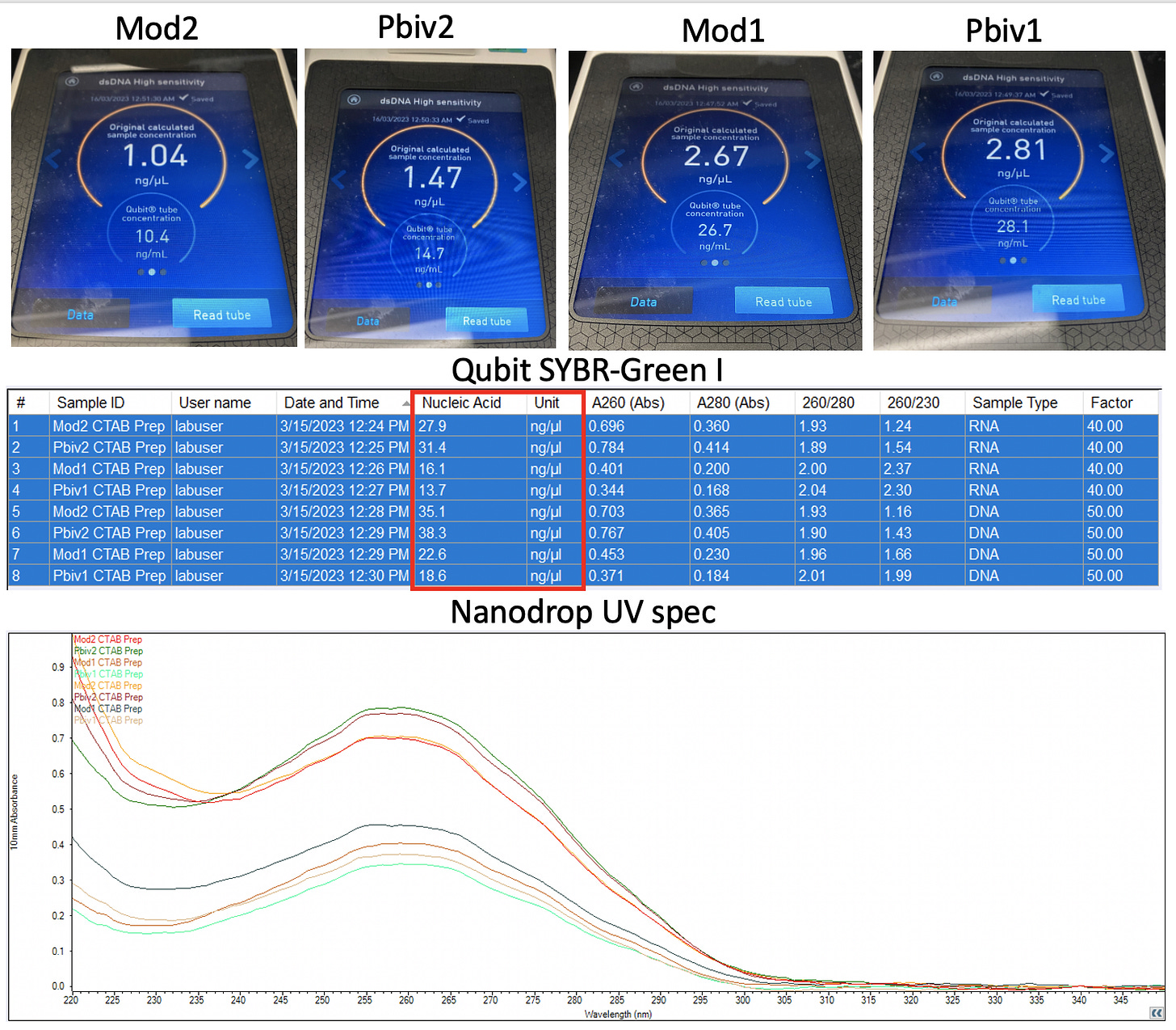 The UV Spec shows an order of magnitude higher at 13-35ng/ul but it really doesn’t itemize RNA from DNA and is a whole nucleic acid measurement.