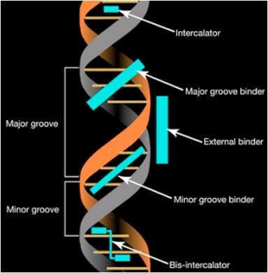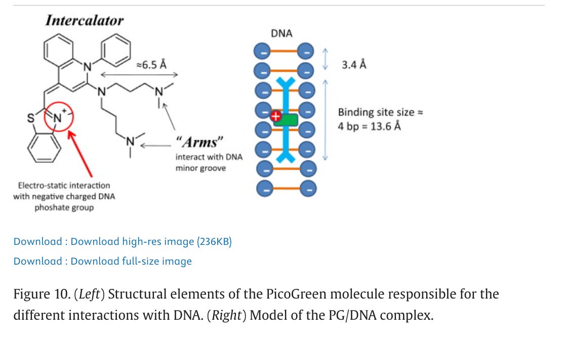 Above is a depiction of Major and Minor grooves in DNA. PicoGreen and AccuGreen are minor groove binders which have a 4bp binding site. This is going to become important as we look at the minimal size of DNA that can trigger PicoGreen signal.
