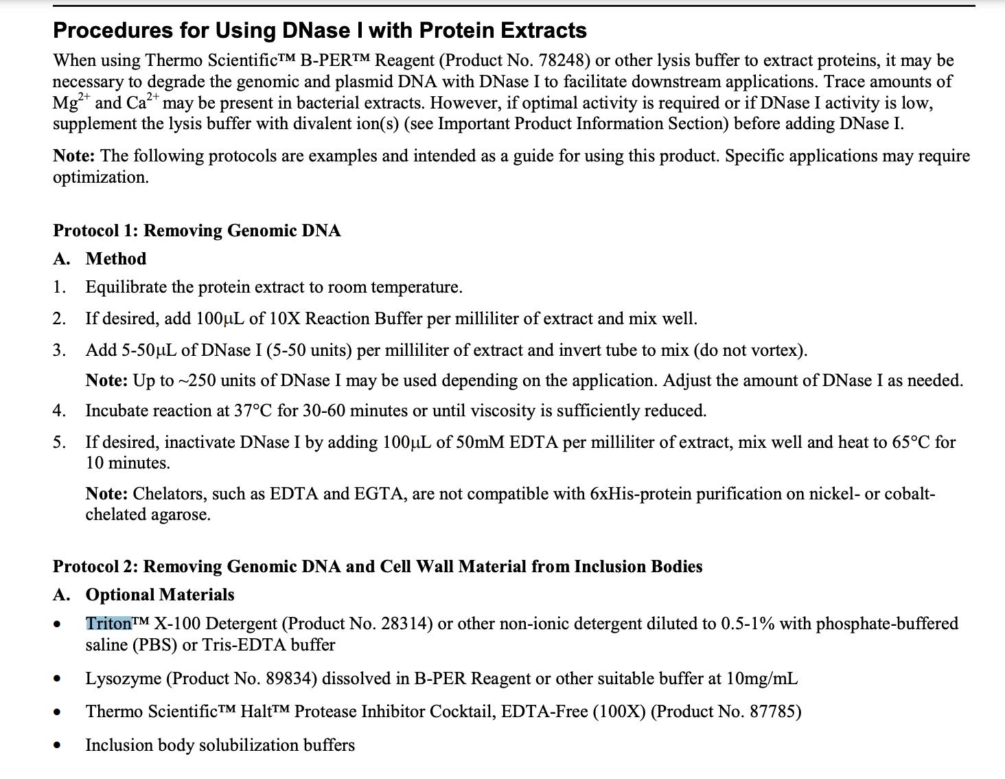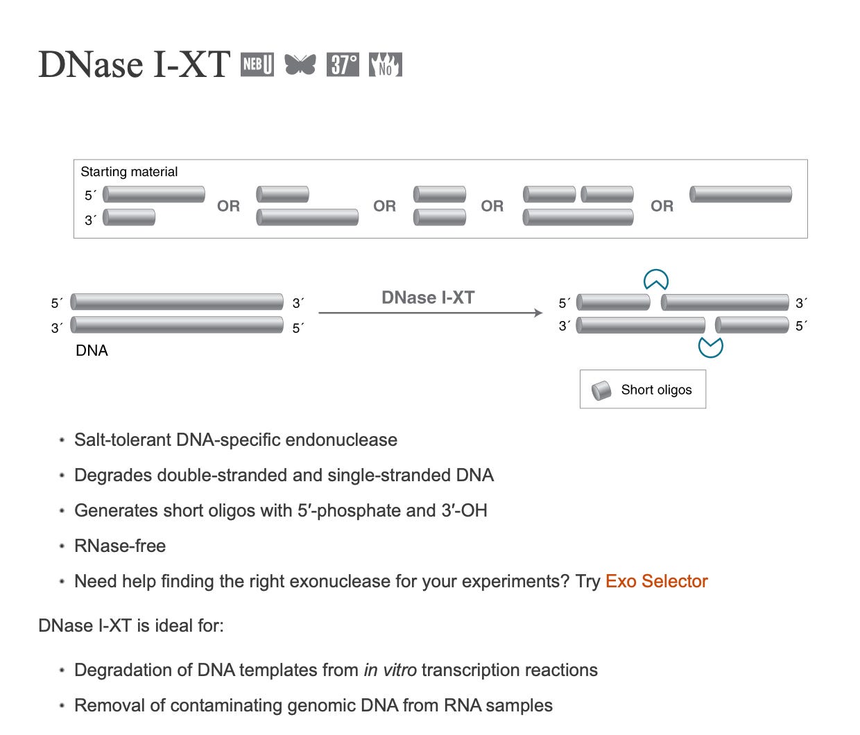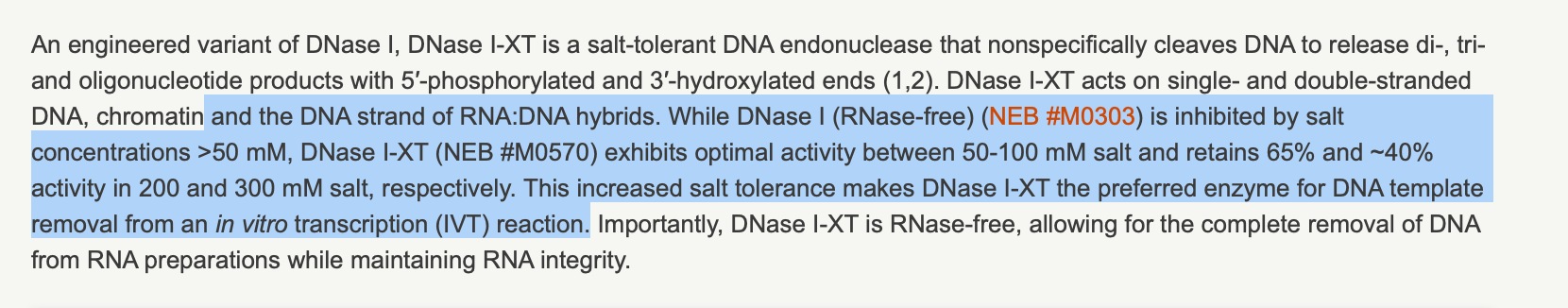 For this experiment we are using a DNaseI from NEB known as DNaseI-XT. This enzyme is optimized to handle DNA generated from an In-Vitro Transcription reaction. The Enzyme is a bit more salt tolerant than DNaseI and is designed to handle DNA:RNA hybrids.