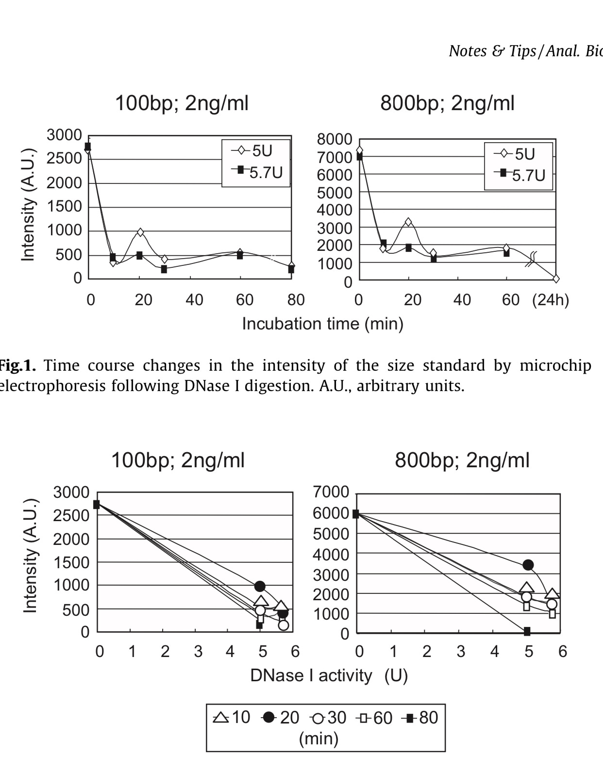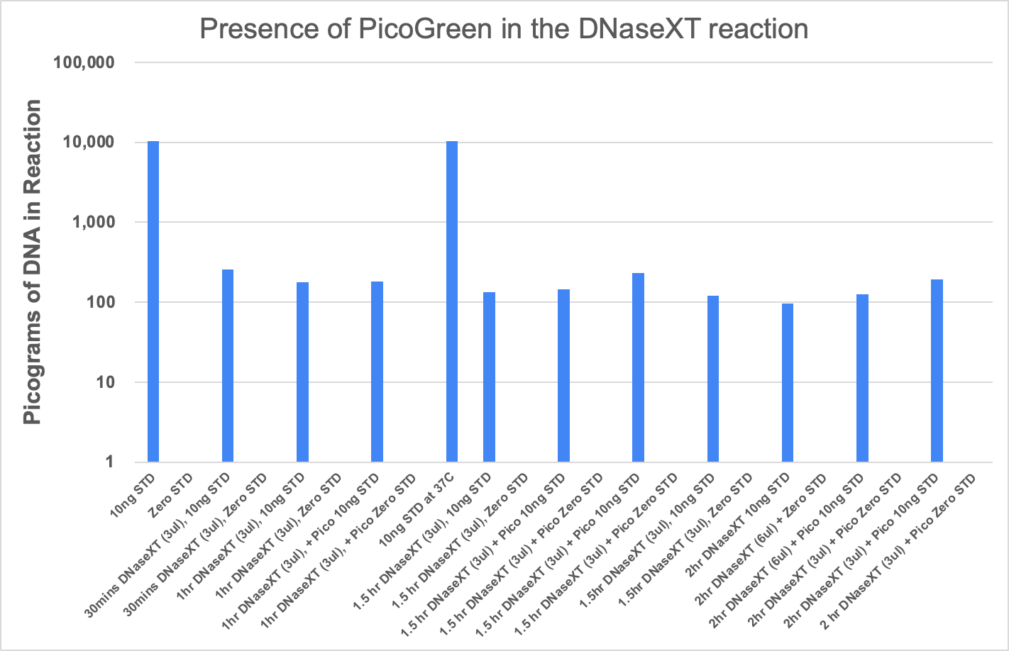 One can see the DNaseI-XT reaction is complete within 1 hour at 37C with 3ul of the Enzyme (2Units/ul). The reactions were performed with 30ul of Standard DNA, 3ul of Enzyme and 3.7ul of 10X reaction buffer. PicoGreen (AccuGreen TM) was added after this reaction and compared to samples that were further digested for additional time in the presence of PicoGreen. We don’t see PicoGreen inhibiting DNaseI-XT. The same DNA floor is hit at ~100 picograms wether the reaction is performed in the presence of PicoGreen or when PicoGreen is added after the reaction.