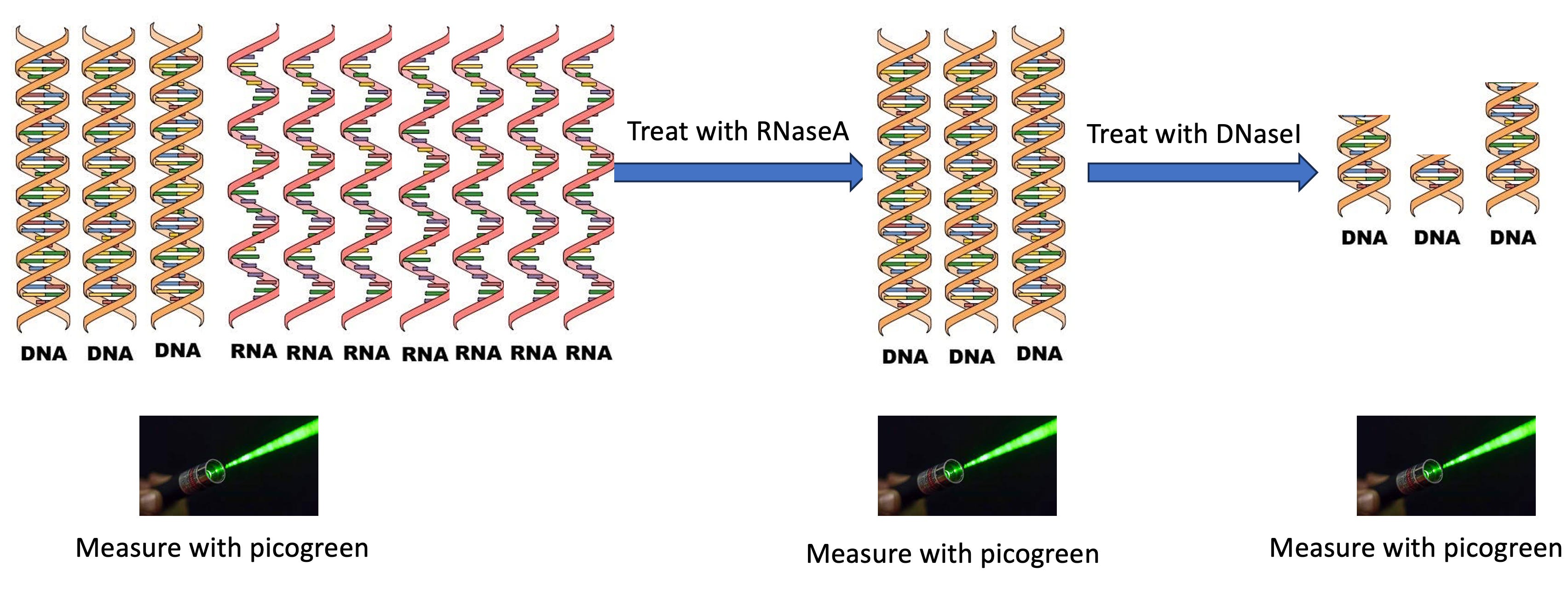 For our application, we are not trying to game a regulation. We are trying to use these Dyes where they have their strongest application justification. So lets use the more specific PicoGreen dye to measure DNA and monitor what happens when we eliminate the RNA with enzymes like RNaseA and DNaseI.