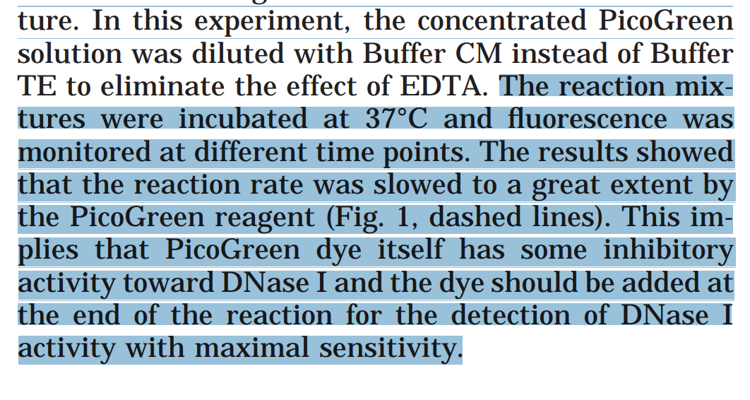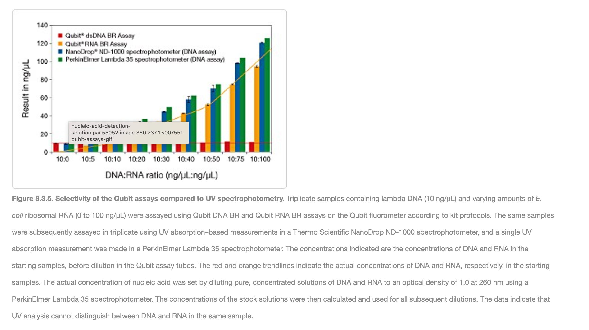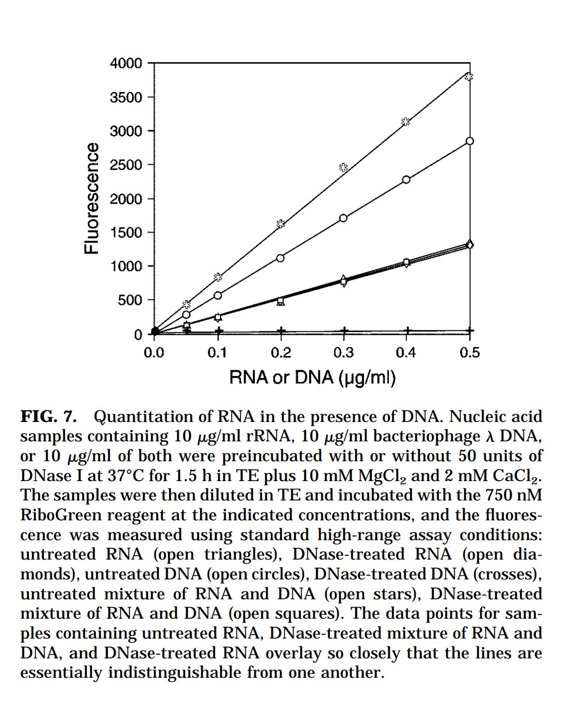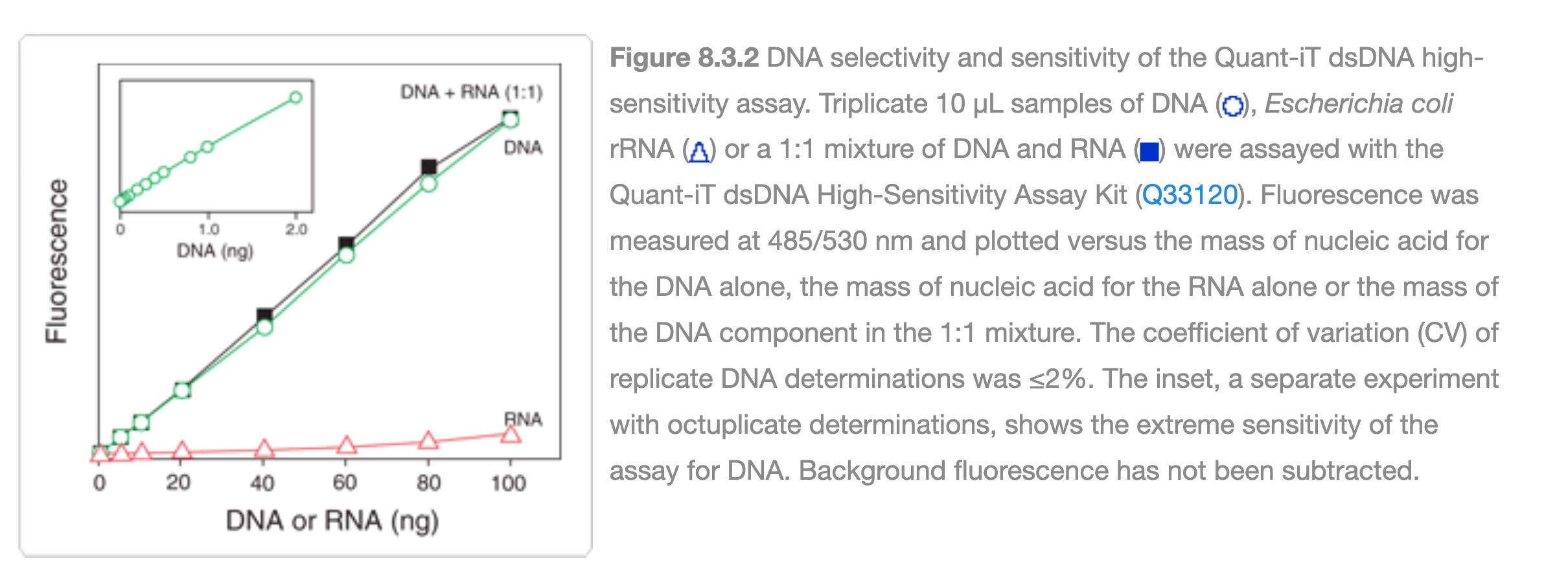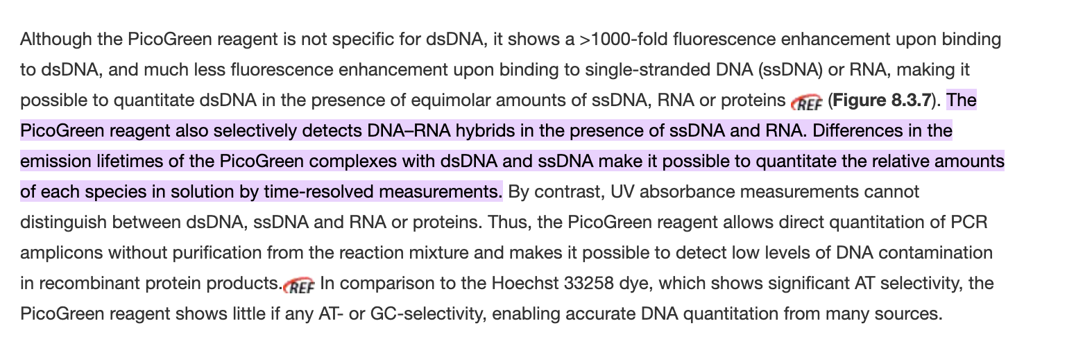 There is also another dye used by Pfizer known as RiboGreen which is more designed to fluoresce in the presence of RNA but even it has more severe cross talk with DNA. The signal is twice as high with equal amounts of DNA so its suggested to use this with only DNaseI treated samples. This 2:1 ratio of DNA:RNA signal for RiboGreen is better than PicoGreen which has a 100:1 preference for DNA over RNA but it really shouldn’t be called RiboGreen given it binds DNA more favorably than RNA.