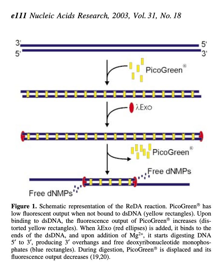 The fluorometry dyes are known as Intercalating dyes. They are minor groove binding dyes which require dsDNA and sometimes dsRNA to bind. They are only fluorescent when bound to a minor groove. Tolun et al. depict PicoGreen binding to dsDNA with Lambda Exonuclease eliminating the fluorescence and monitoring this in realtime.