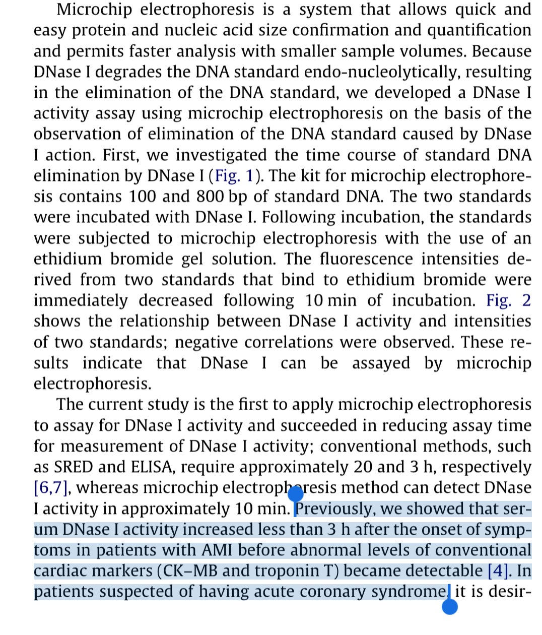 DNaseI activity in the serum is up-regulated within 3 hours in AMI patients. This marker can be detected before troponin levels increase.