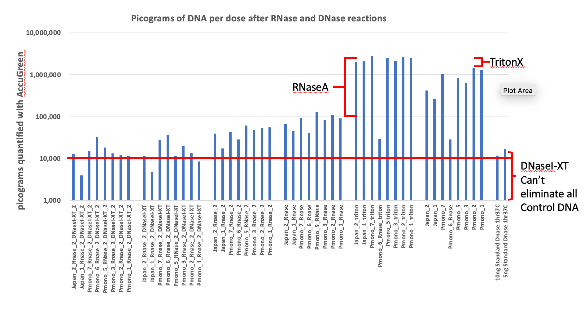 The chart is on a LOG scale. This ranges from 17.5-61.8 ng/dose with the lowest sample being a Comirnaty vaccine from Japan. The DNA remaining after 2 rounds of DNaseI-XT digestion is degraded down to the DNA levels observed with the standard DNA digestions with DNaseI-XT.