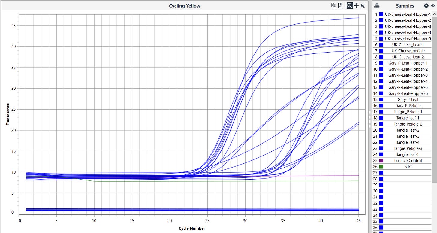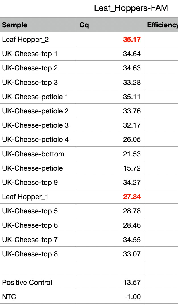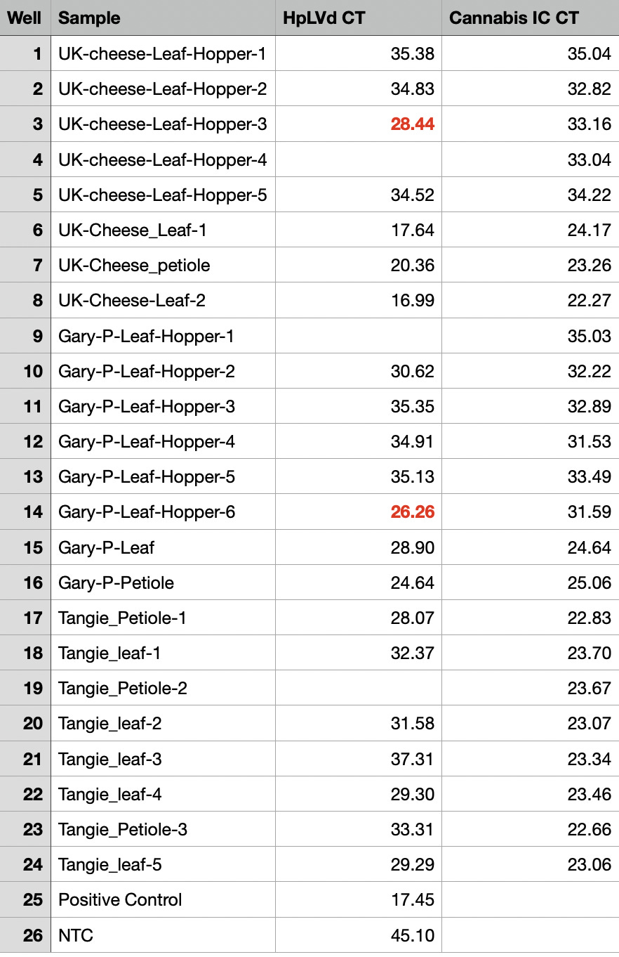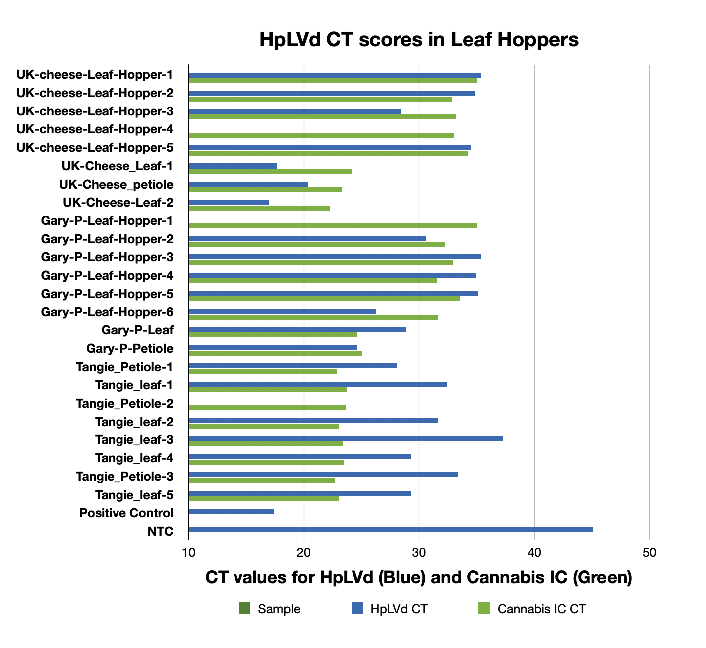 The expanded survey of 11 Leafhoppers reproduced the detection of HpLVd in 9/11 Leafhoppers. CT scores varied with 7/9 being late CT (n=9 average = CT 32.8). Two of leafhoppers in the second screen had CT scores of 26.3 and 28.4. The originally infected UK Cheese leaf samples had CT scores averaging 18.3 (n=3), while the cultivars that were negative in vegetative state (Gary Payton and Tangie) had much later HpLVd CTs scores (9,900 fold lower copy number or 13.3 delta CT) suggestive of later infection.