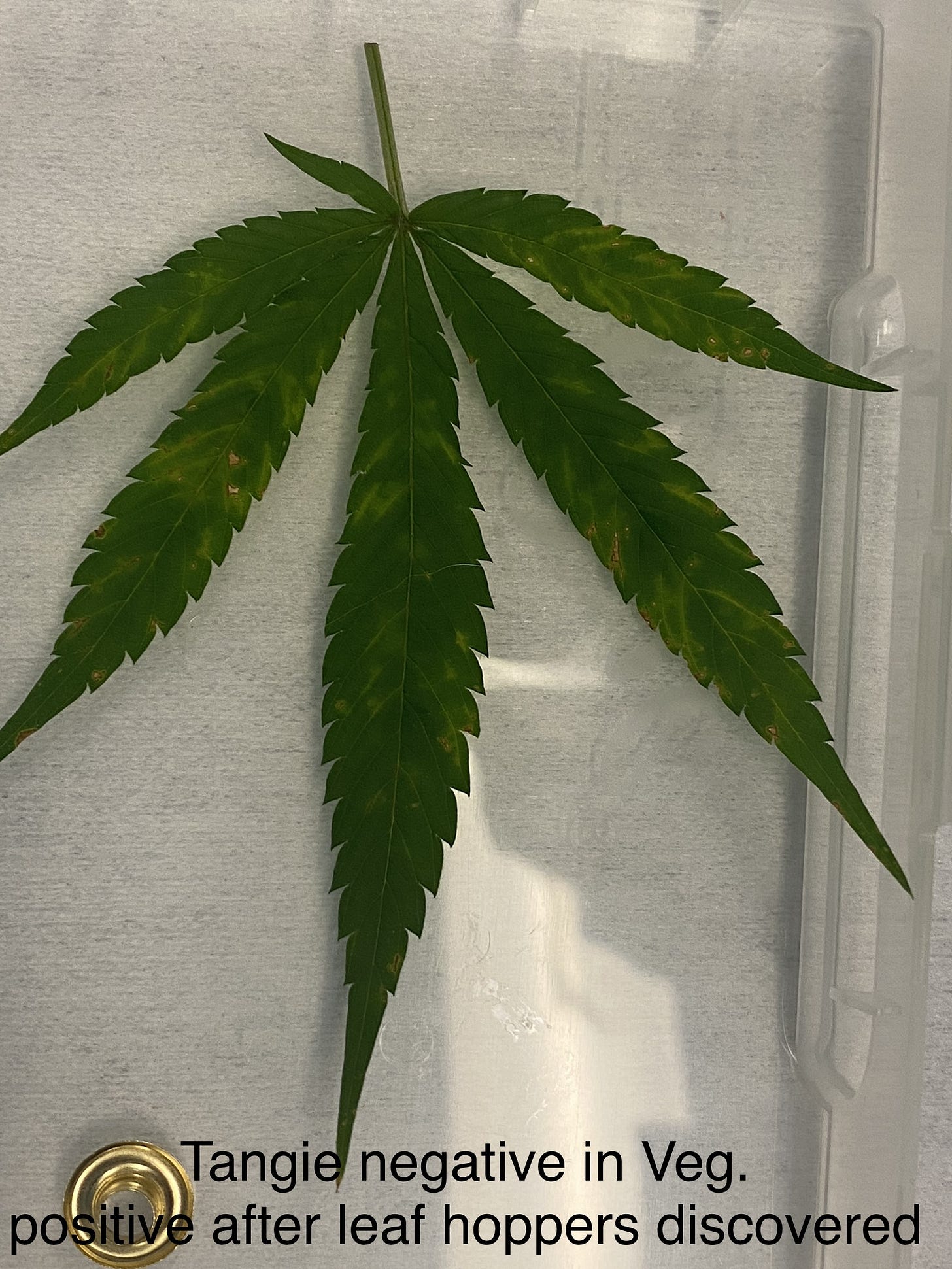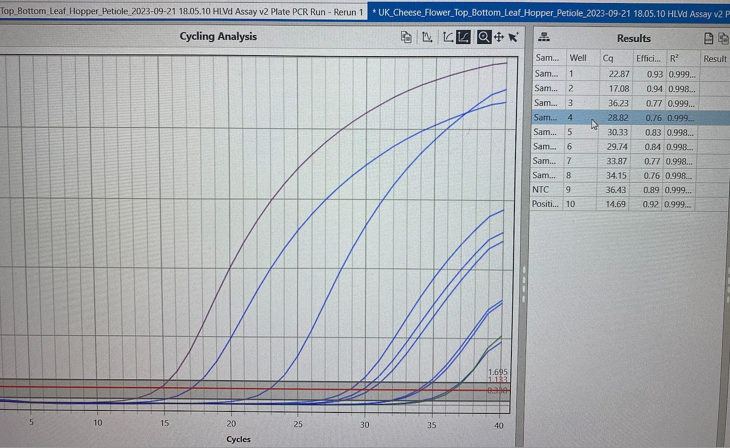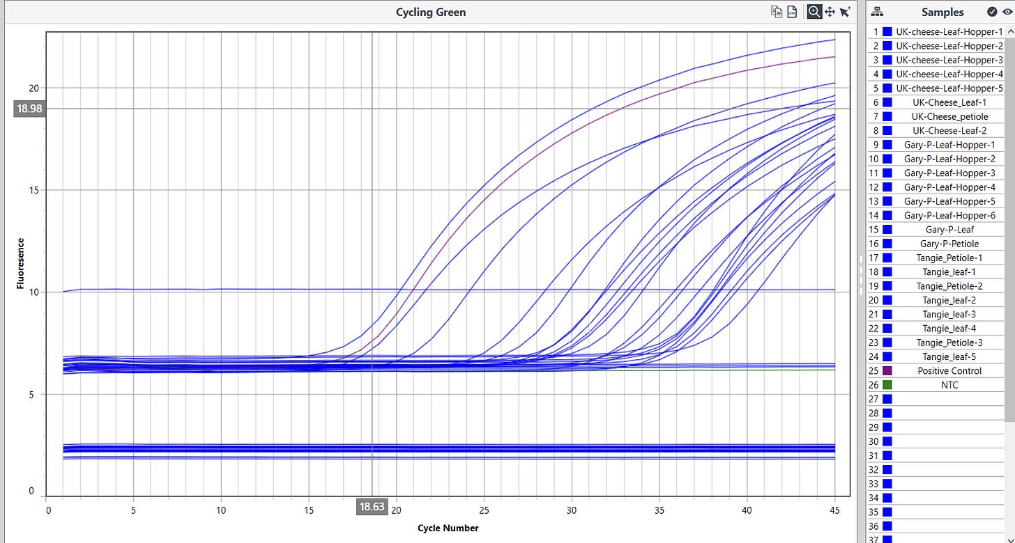 The expanded survey of 11 Leafhoppers reproduced the detection of HpLVd in 9/11 Leafhoppers. CT scores varied with 7/9 being late CT (n=9 average = CT 32.8). Two of leafhoppers in the second screen had CT scores of 26.3 and 28.4. The originally infected UK Cheese leaf samples had CT scores averaging 18.3 (n=3), while the cultivars that were negative in vegetative state (Gary Payton and Tangie) had much later HpLVd CTs scores (9,900 fold lower copy number or 13.3 delta CT) suggestive of later infection.