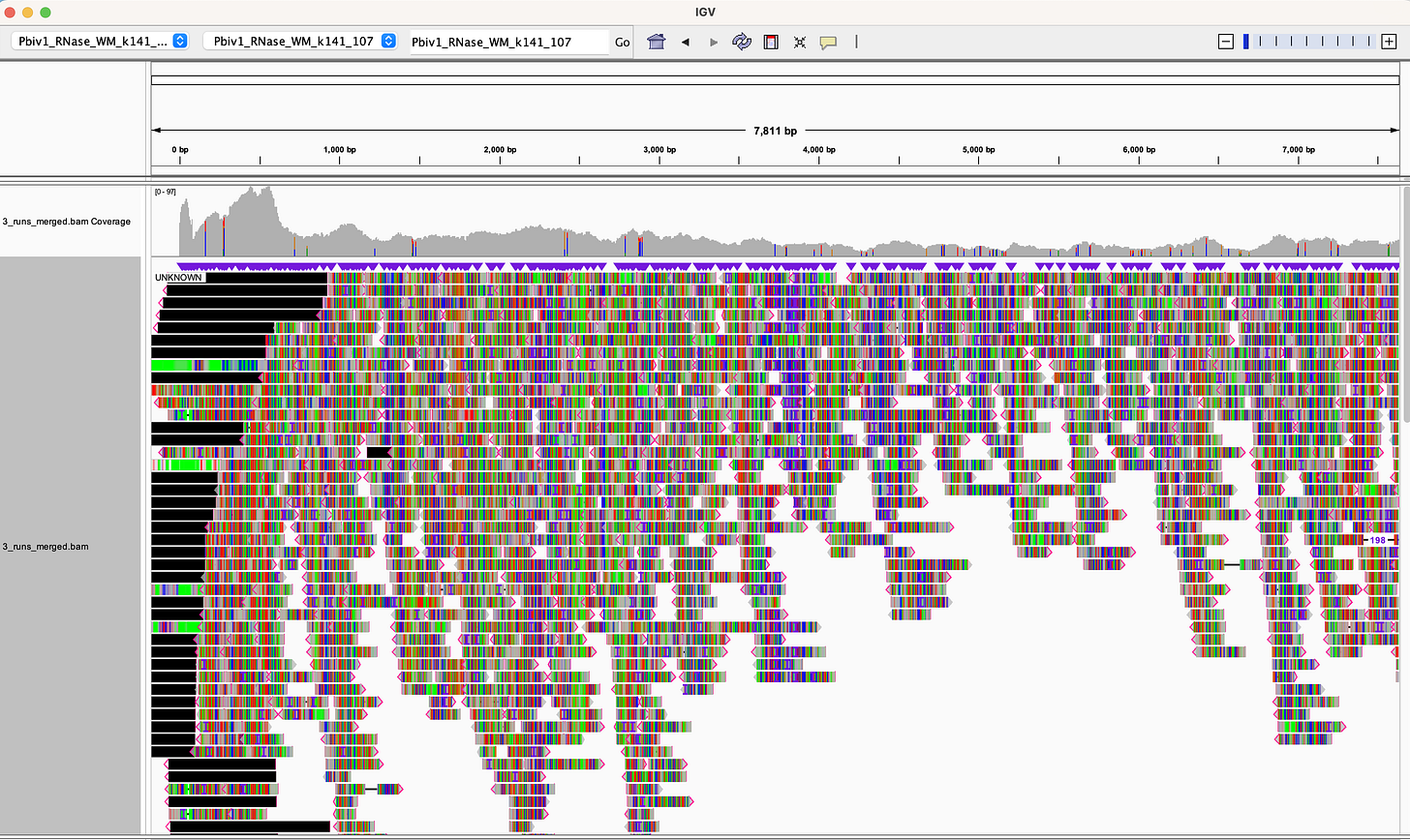 We get far fewer reads (866) but they look more evenly distributed. There is some elevated coverage over the PolyA tract as that low complexity region of sequence is recruiting some noisy reads (Black) into the picture.