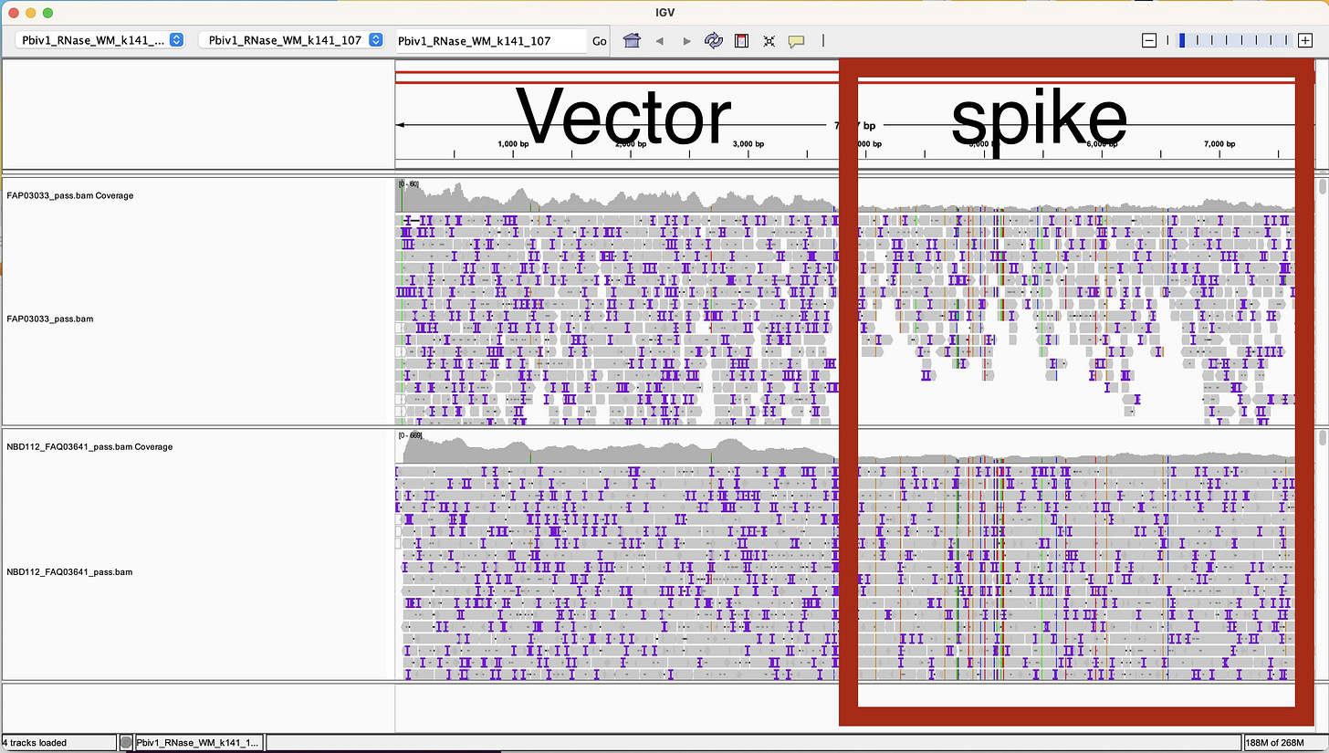 Dr. Buckhaults produced some ONT data on an earlier ONT kit protocol (V9). He purified DNA from 15mls of vaccine. He did not use an RNase A step to get rid of the RNA and while he got great coverage across the entire vaccine plasmid, we can see there is lower sequence coverage over the spike portion of the sequence than the vector (Grey top track in IGV viewer below). The IGV view (Figure 2) was generated by our team from the data Dr. Buckhaults placed public on Twitter.