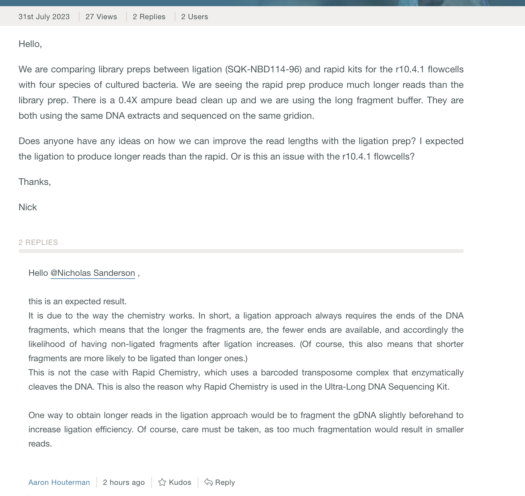 We haven’t had success using the ONT rapid kits mentioned in the above tech-blog. There may be a minimum size fragment these transposon based approaches can work with due to the footprint of the transposase enzyme. Once we migrated to Ligation based kits we began to see more reads but we know these reads are biased for shorter fragments in the library construction steps. There is also a diffusion bias. The shorter fragments diffuse faster and load the pores preferentially over the longer fragments. Ultimately we will need to normalize for these effects by ONT sequencing a DNA ladder with known concentrations of different sizes (Figure 1). That is an experiment for another day.