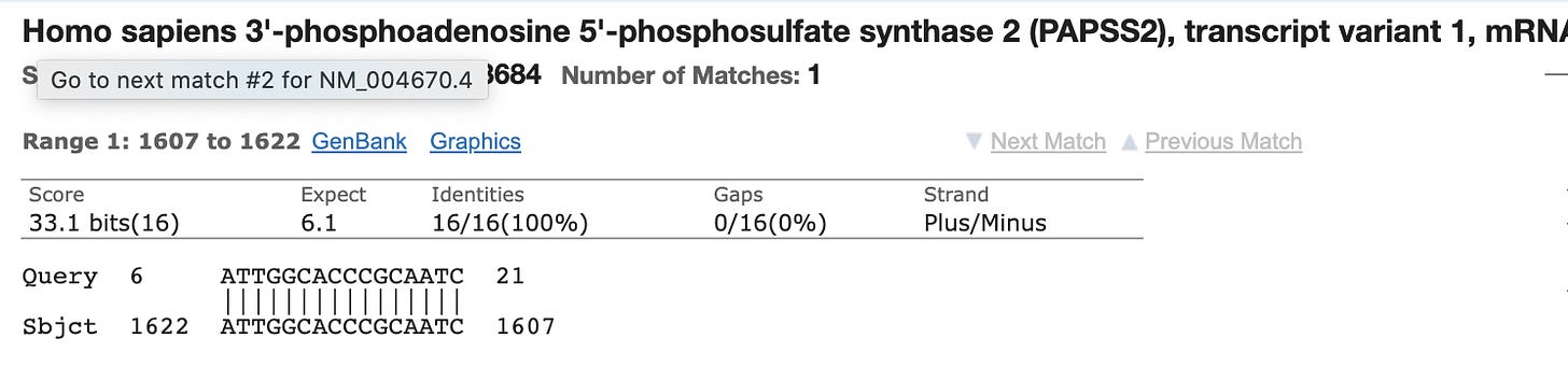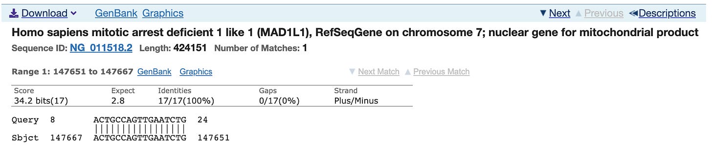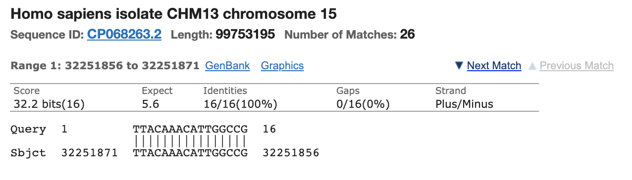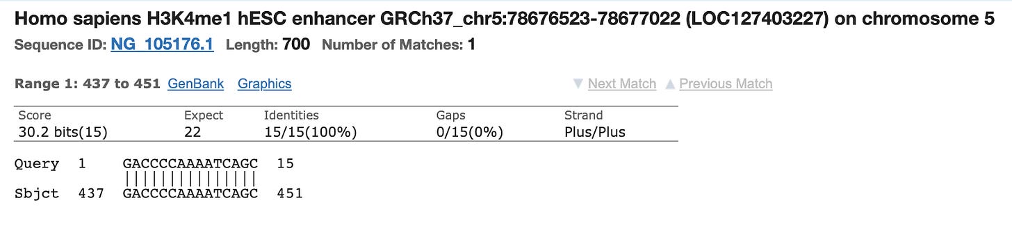 Most people discounted this finding as the other primer only has homology to Chromosome 5 and its homology is only 15 bases and it doesn’t include the AAAT sequence on the 3’ end of the primer. You can’t get a PCR product to form between different chromosomes in the genome as the target DNA is not contiguous.