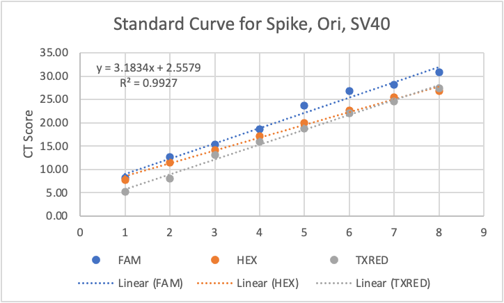 Speicher et al highest sample was 4.3ng/dose with qPCR CT of 18.44 on Ori and a SV40 CT of 16.99. This is a delta CT (between Speicher et al SV40 signal on the highest lot and the SV40 on this lot) of 16.96-12.72 = 4.18. 2^4.18 should equate to 18.13X more DNA than the highest sample published in Speicher et al. This would be 77.3ng/ul according to his standard curve.
