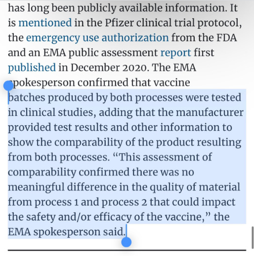 They close out the Pfizer Pravda with a statement from the EMA claiming Process 1 vs Process 2 was compared and deemed to be of no consequence?