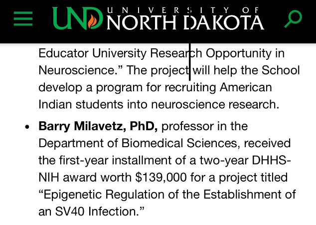 Funding from NIH for UND is Over $13M. A paper emerges that challenges the $550M royalty stream from mRNA vaccines that threatens the NIH’s credibility and they pull starving Barry out to downplay the SV40 contamination in these vaccines.