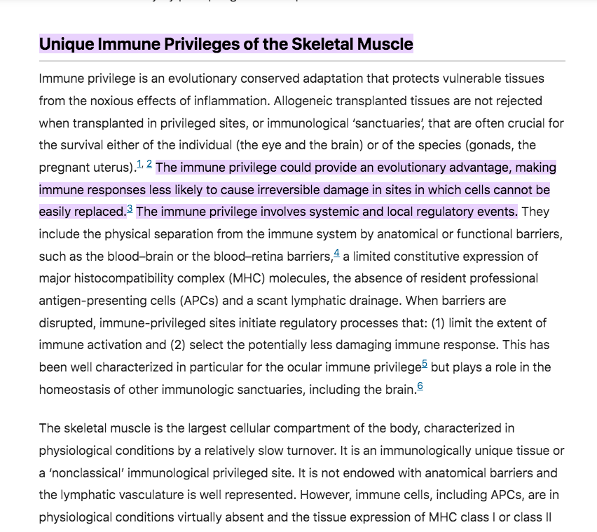 Yes, muscle cells don’t divide but the price you pay for this is the immune system attenuates its function on cells that are hard to replace. They are ‘non-classical’ immune privileged tissue.