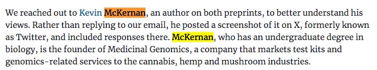 Kate Yandall wasted no time pointing out my lack of PhD and my focus of research being in Cannabis and Psilocybe. Not only was she willing to make a hyperlink to our company website, in the same sentence, she avoided at all cost linking to my rebuttal of their hit pieces. Just had to underscore my undergraduate degree in biology related to the cannabis-mushroom industries.