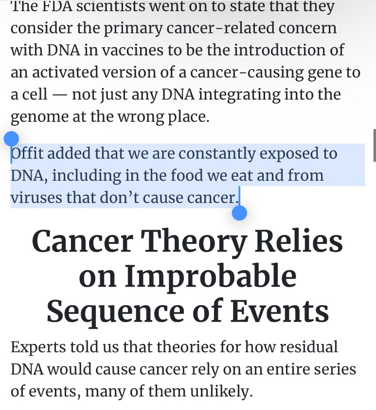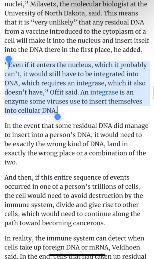 So not only is Offit confused about oral versus injected routes of delivery and Food vs LNPs, he is oblivious about LINE-1 and the spontaneous integration of dsDNA documented by Lim et al. He can’t be this clueless. This is intentional squid ink or the man was born in the era of the rotary phone and likely needs his kids to install Apps on his phone.