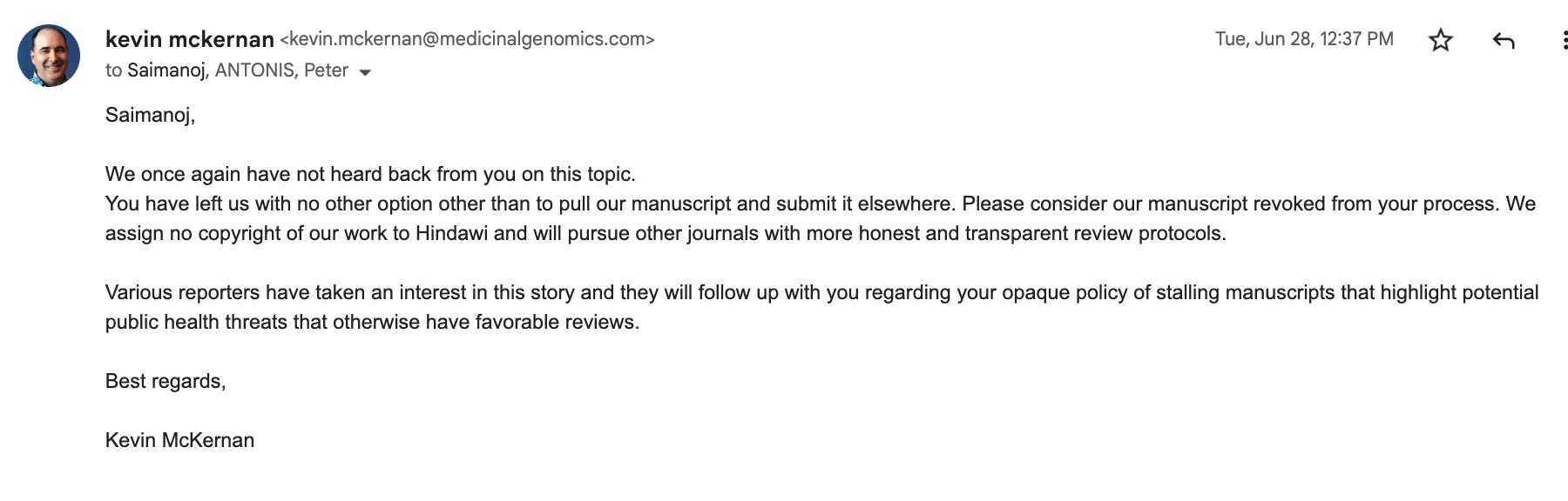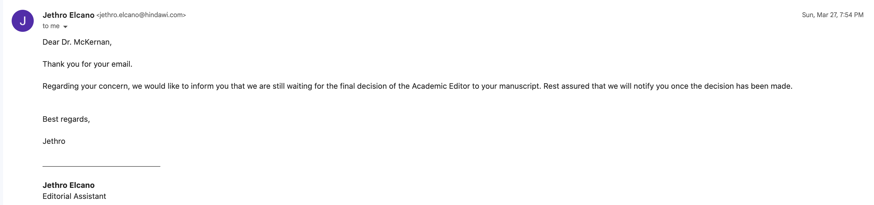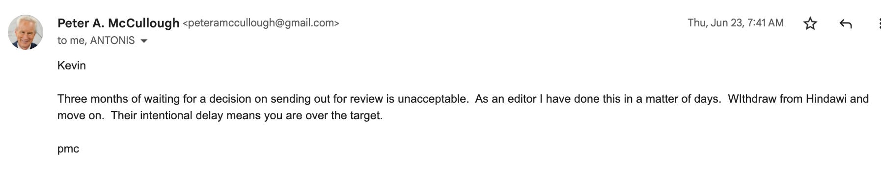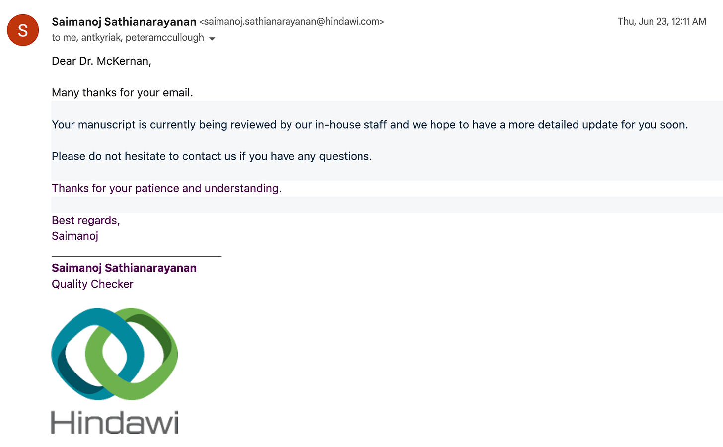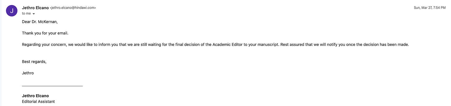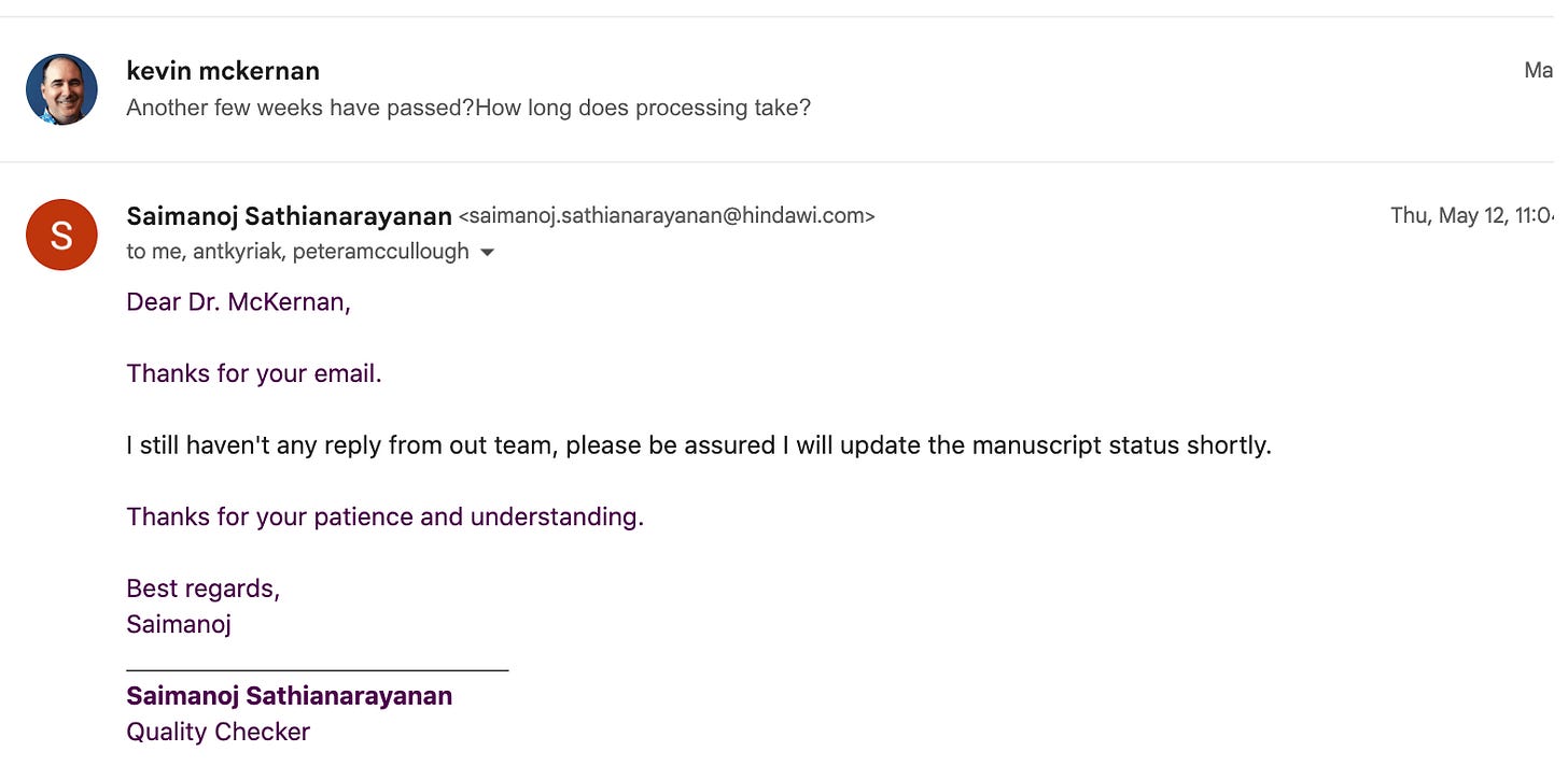 Peter, being an editor was more patient than me but he finally threw in the towel and we aborted ship on Hindawi in Late June.