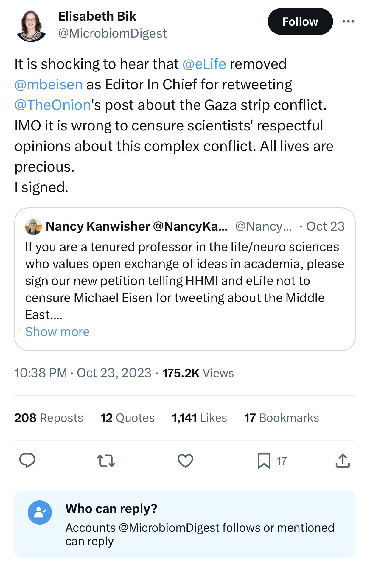 likewise, team censorship is now crying about the removal of Michael B. Eisen from eLife’s board over a charged Onion tweet.