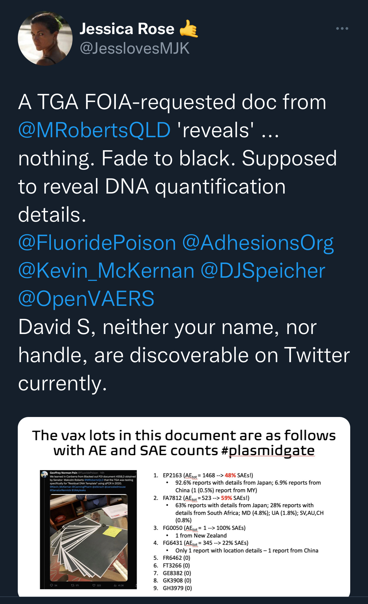 Geoff Pain PhD FOIA’d the TGA for DNA levels. Every Vaxophile on Twitter swears the TGA is testing everything.