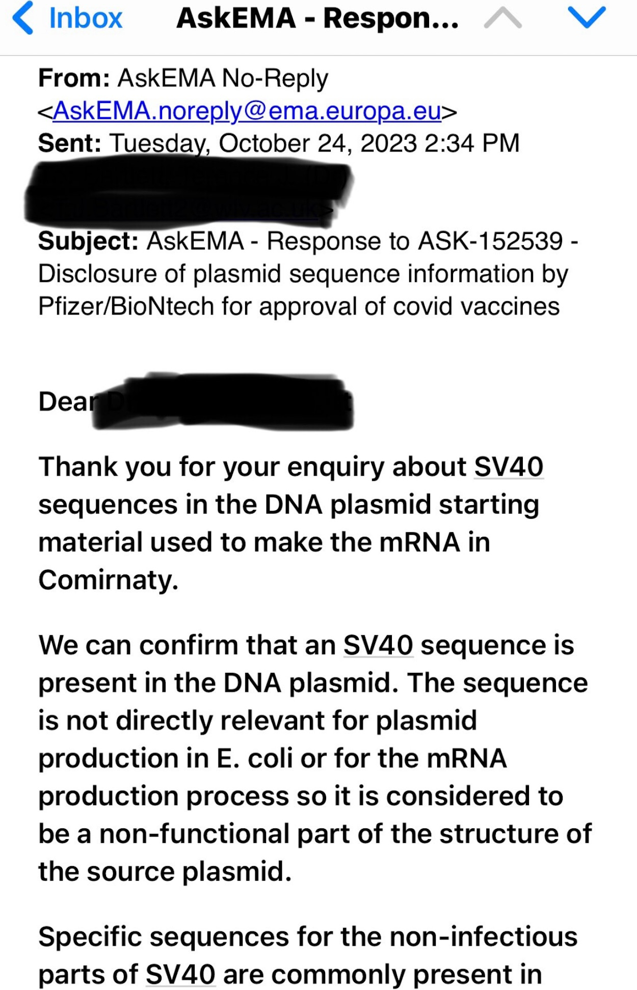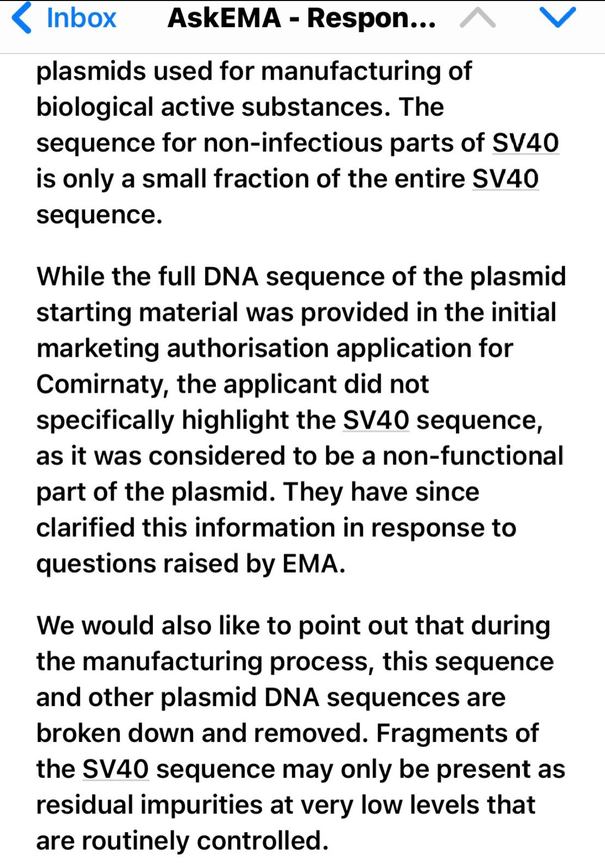 Meanwhile, someone asked the EMA about their thoughts on the SV40 issue. I can’t vouch for the veracity of these emails so I have sent in my own inquiry.