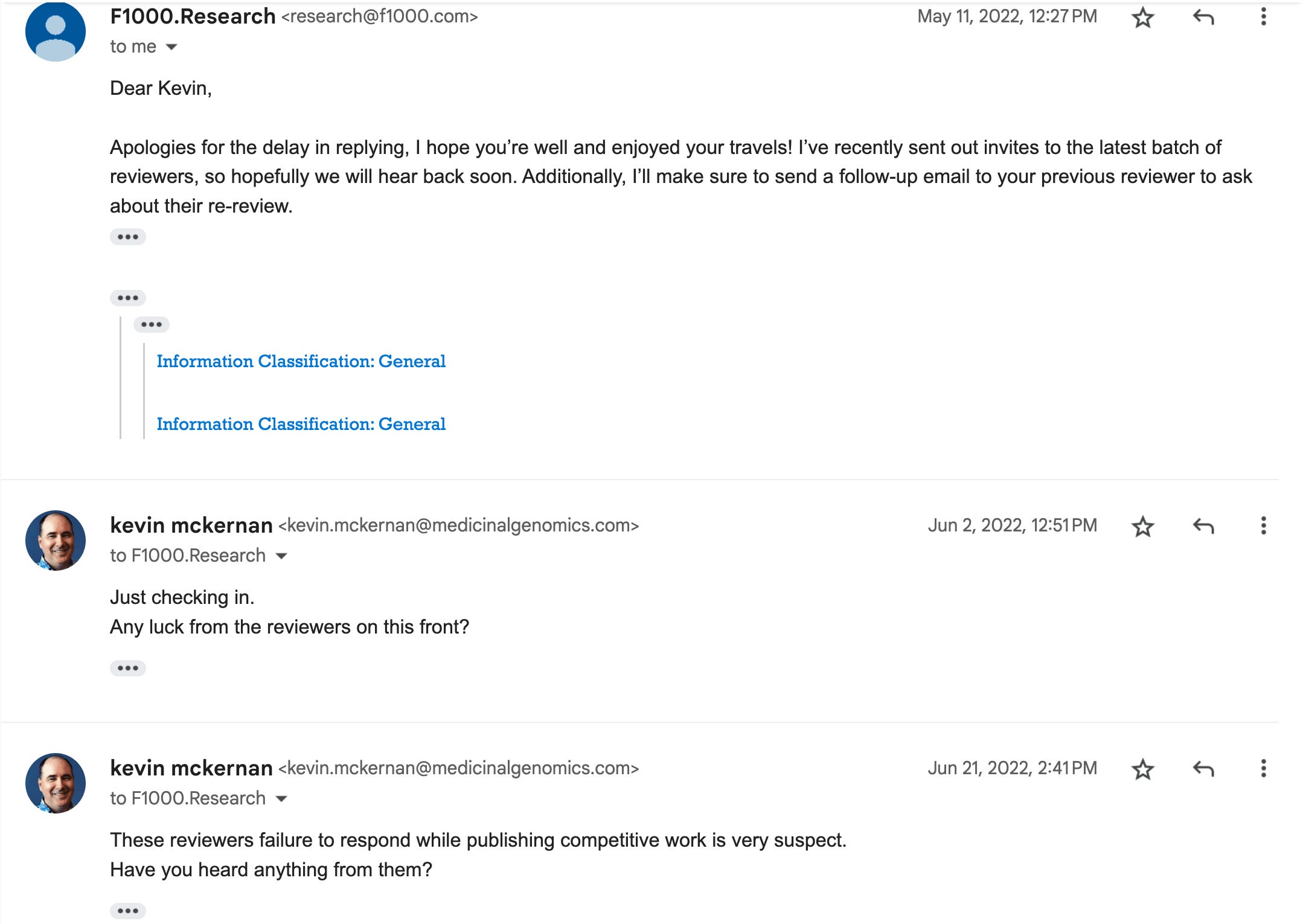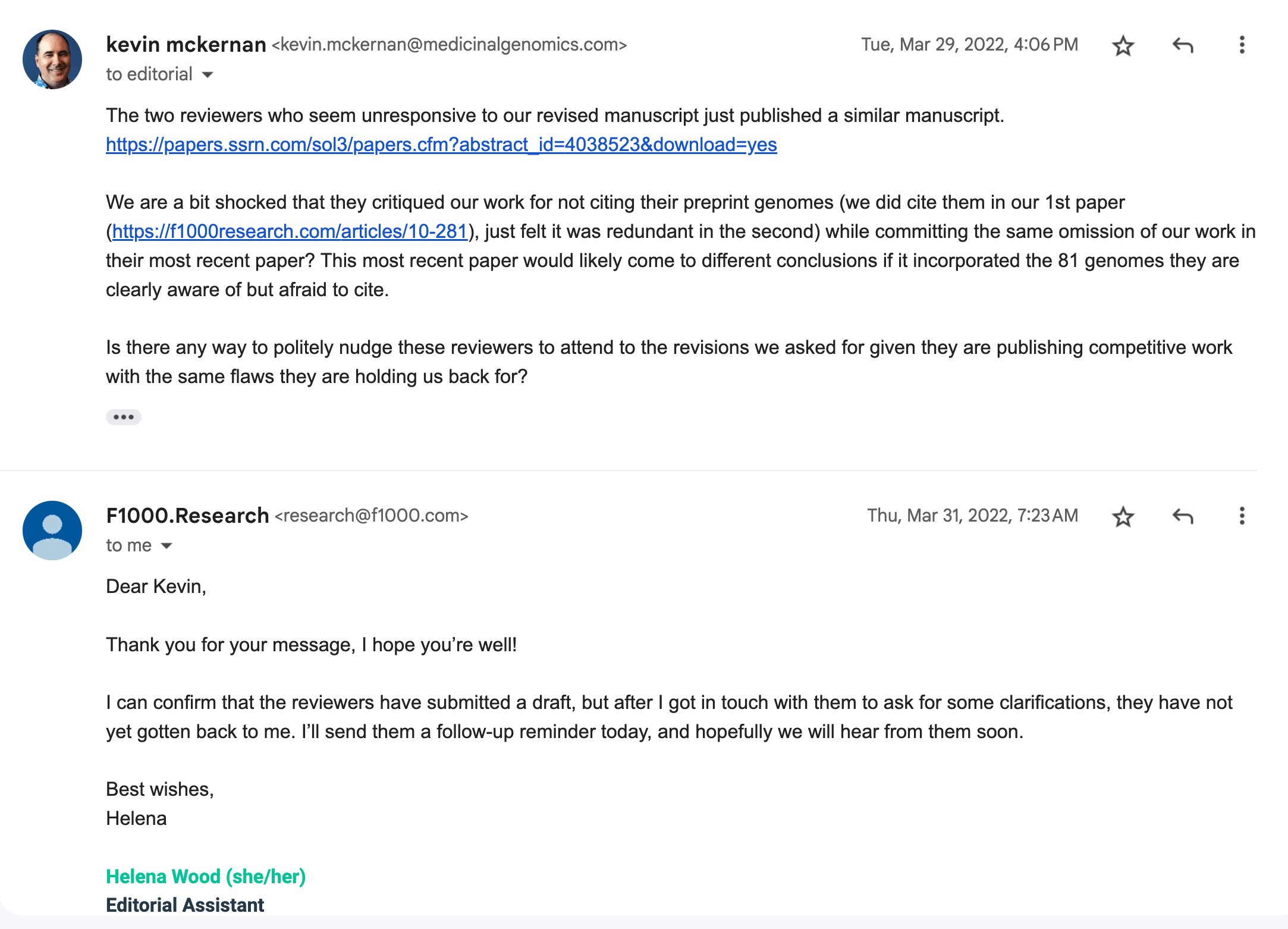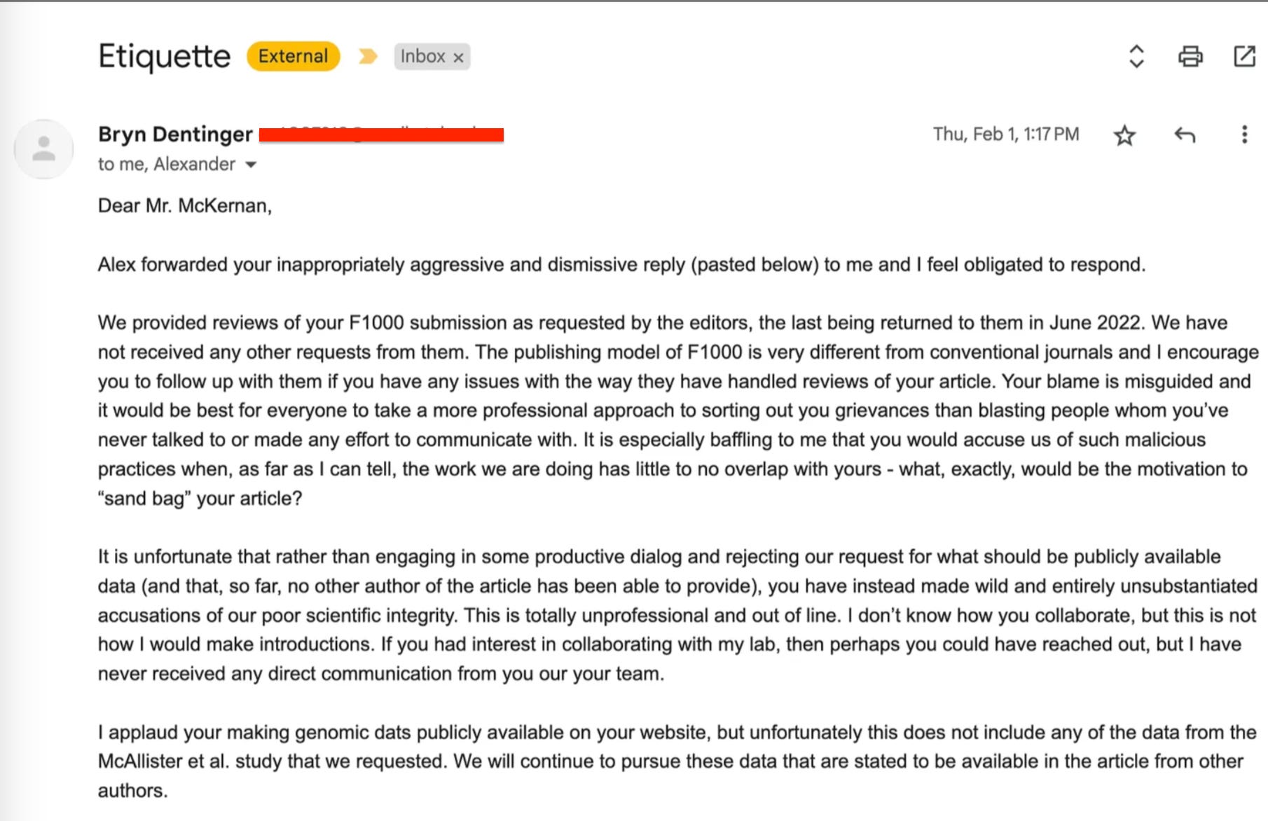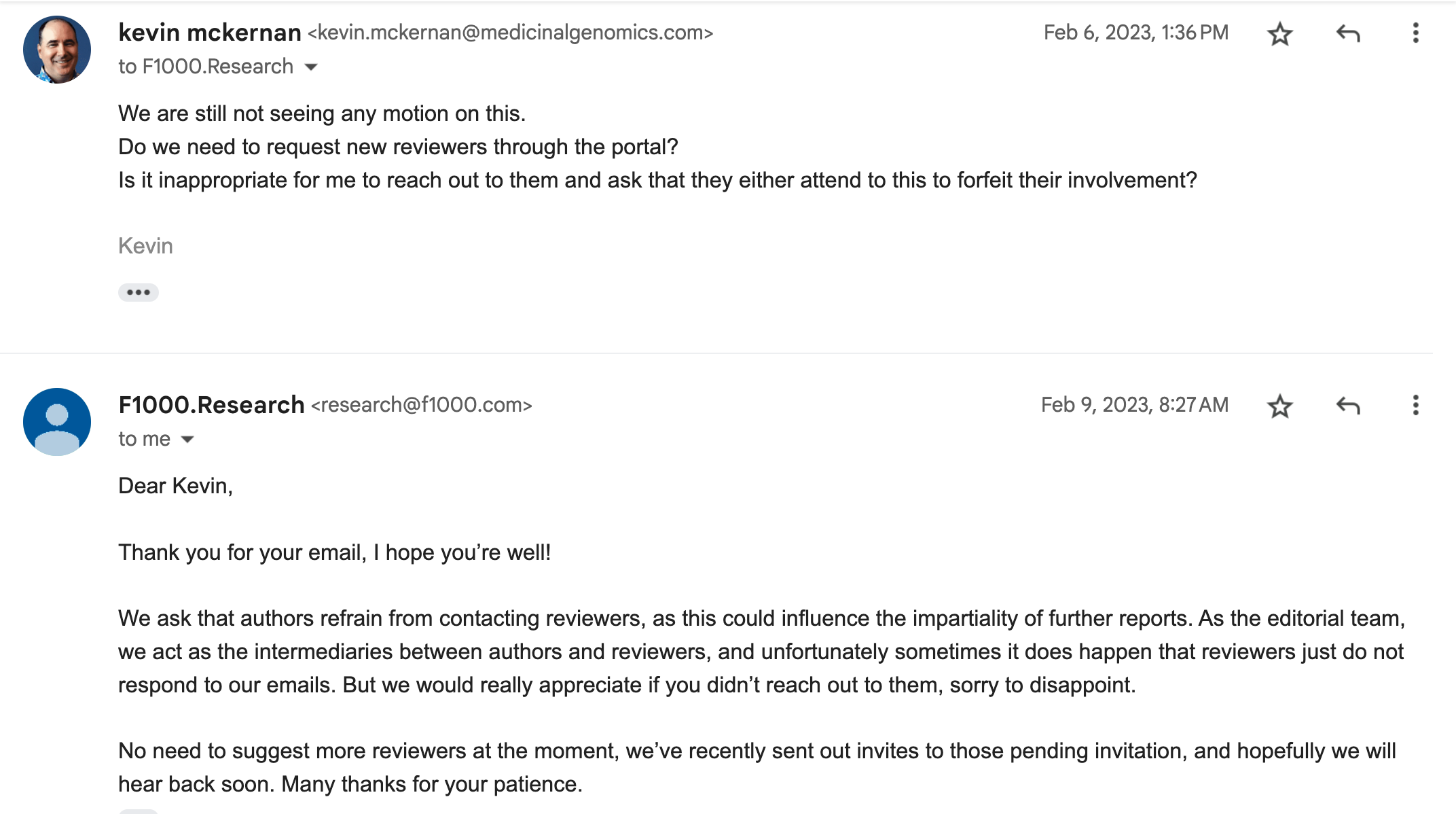 So even in fields where you think researchers would have some experience with dissolving their Ego, there is in fact too much to go around. I’m sympathetic for F1000 in all of this. They don’t get paid until the paper publishes. They were tortured with all of this work without any reimbursement. They clearly grew tired of the case and never responded to any emails once Bryn and I were on the same chain. I don’t blame them.