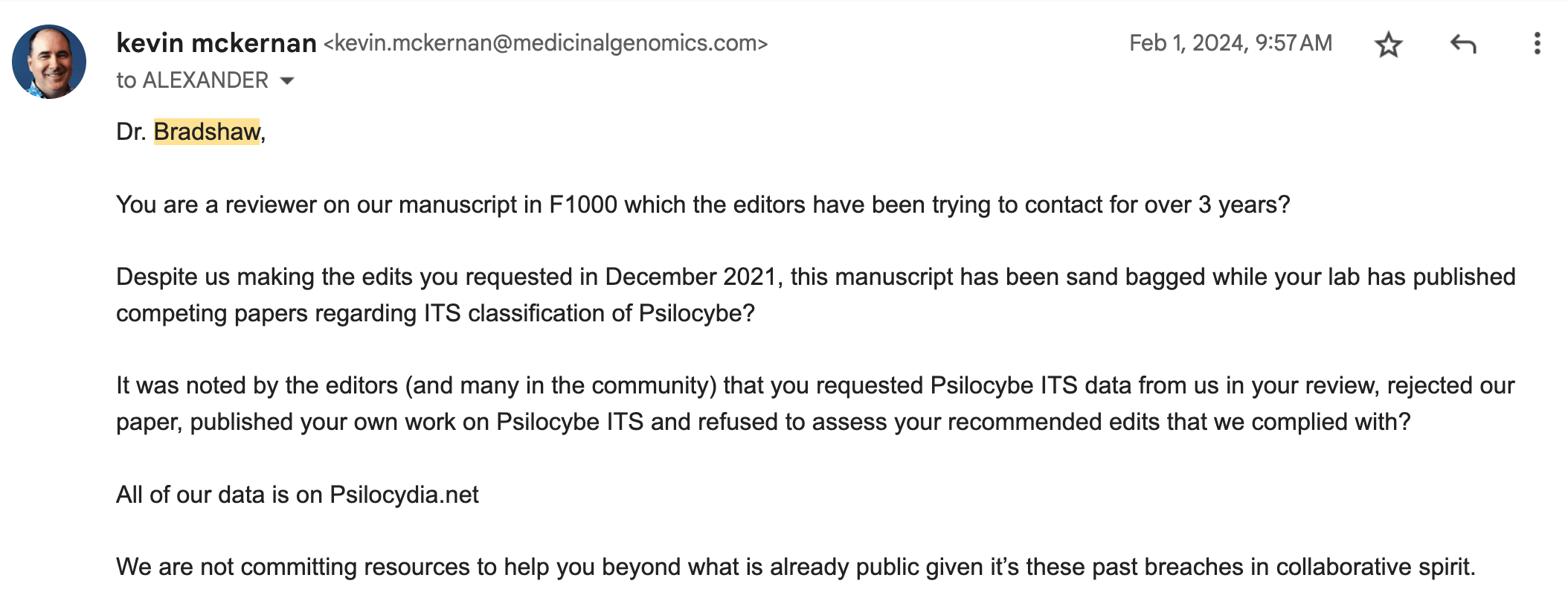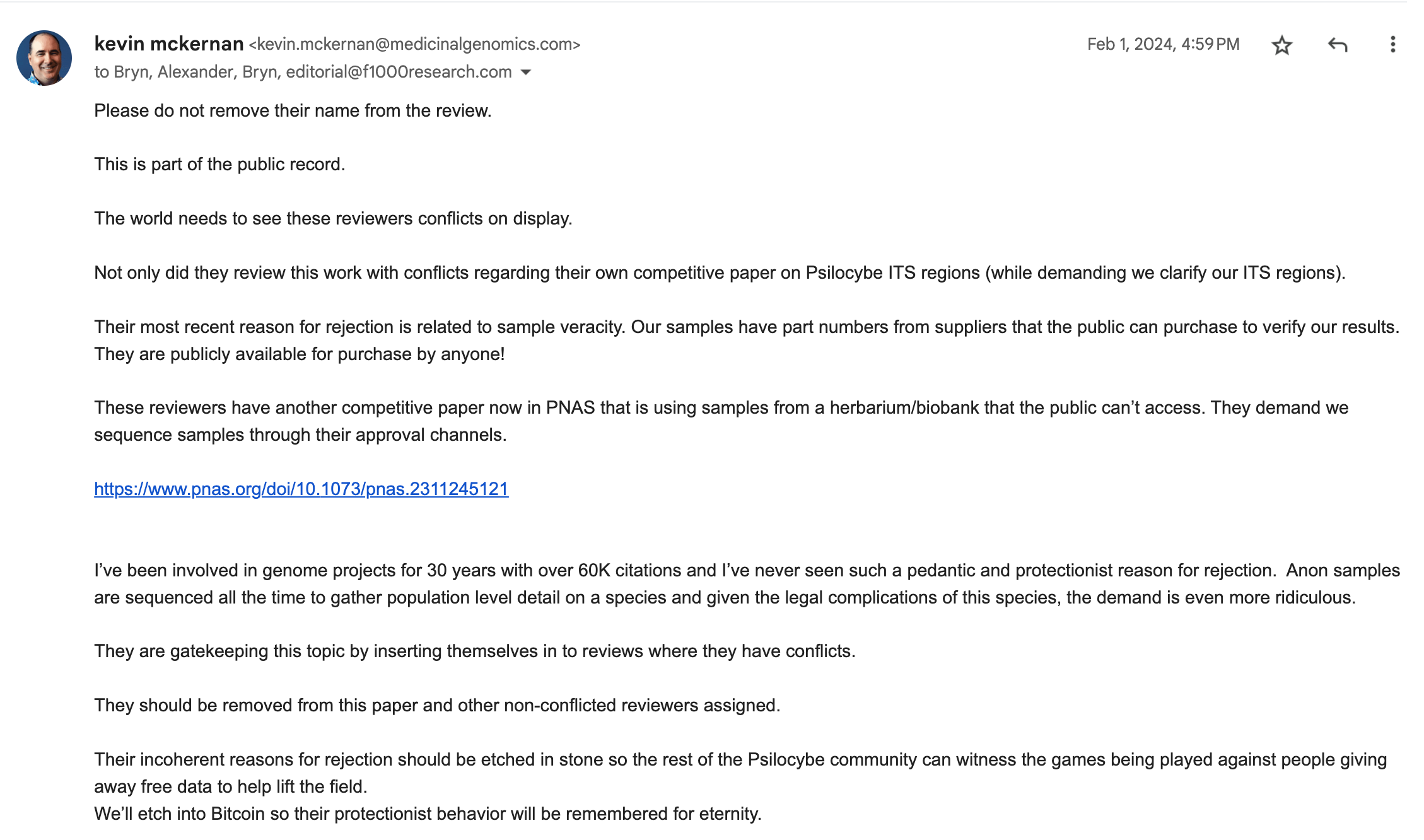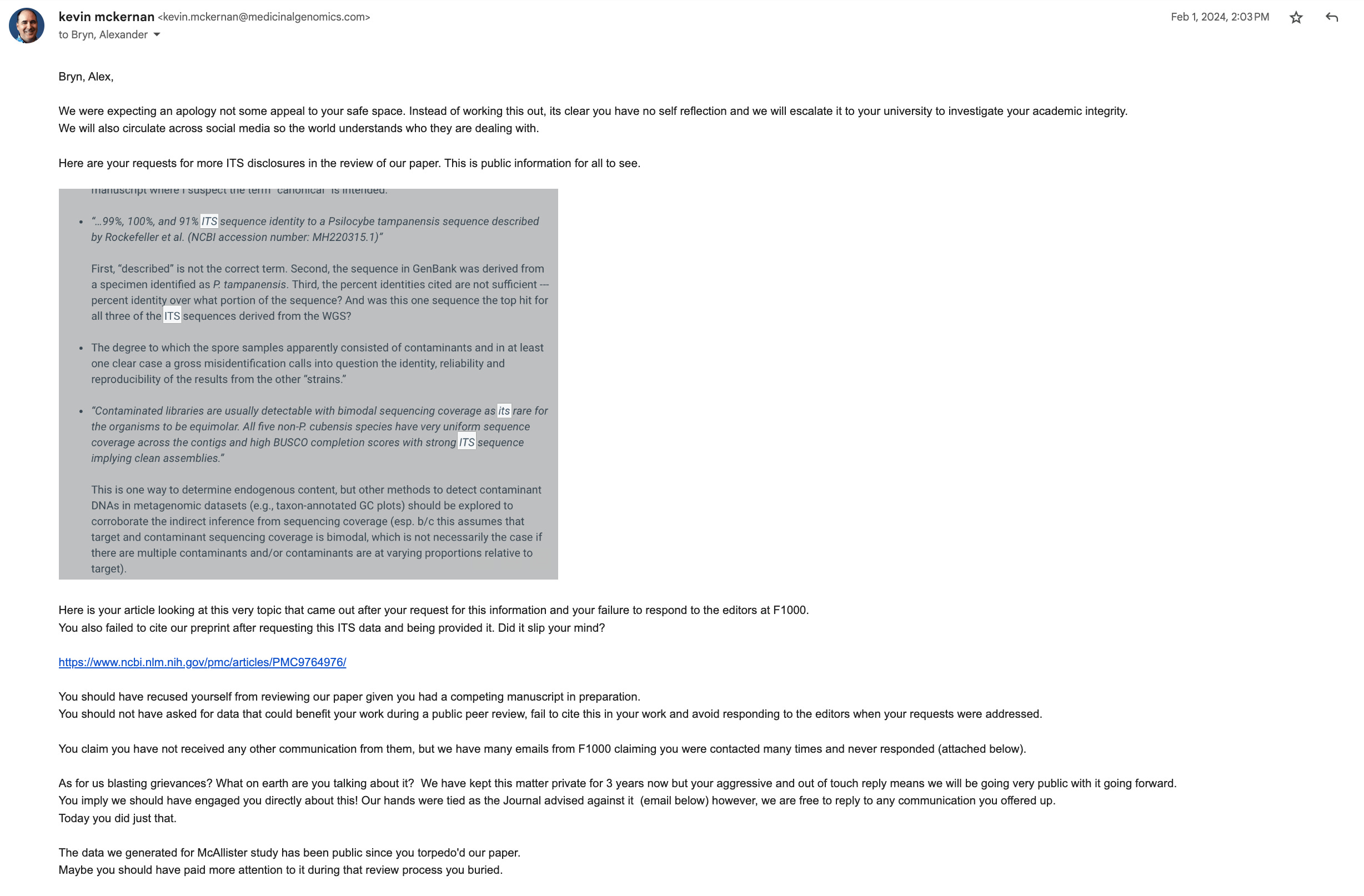 He is rejecting the paper because he is projecting concern over the data in the same email thread that he came crawling back begging for the data in 2024! This is insult to every spore provider and medical patient. These academics don’t want your stuff sequenced unless they do it first and they definitely look down upon all of the spore companies performing excellent documentation of the genetics they sell.