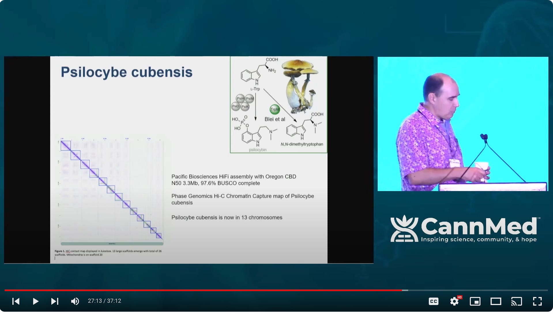 In 2021 we decided to extend this public work to Psilocybe cubensis as we witnessed patients using these tryptamines in breast cancer therapy. We began by first constructing the best Psilocybe cubensis genome assembly to date. This is now the reference genome in NCBI for this species. I presented this genome project at CannMed.