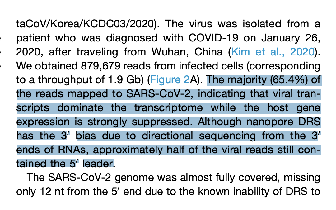 The other detail discovered in this paper is that 65% of the mRNA in the sample is SARs-CoV-2 RNA. More viral RNA than host RNA! This supports Butler et al.