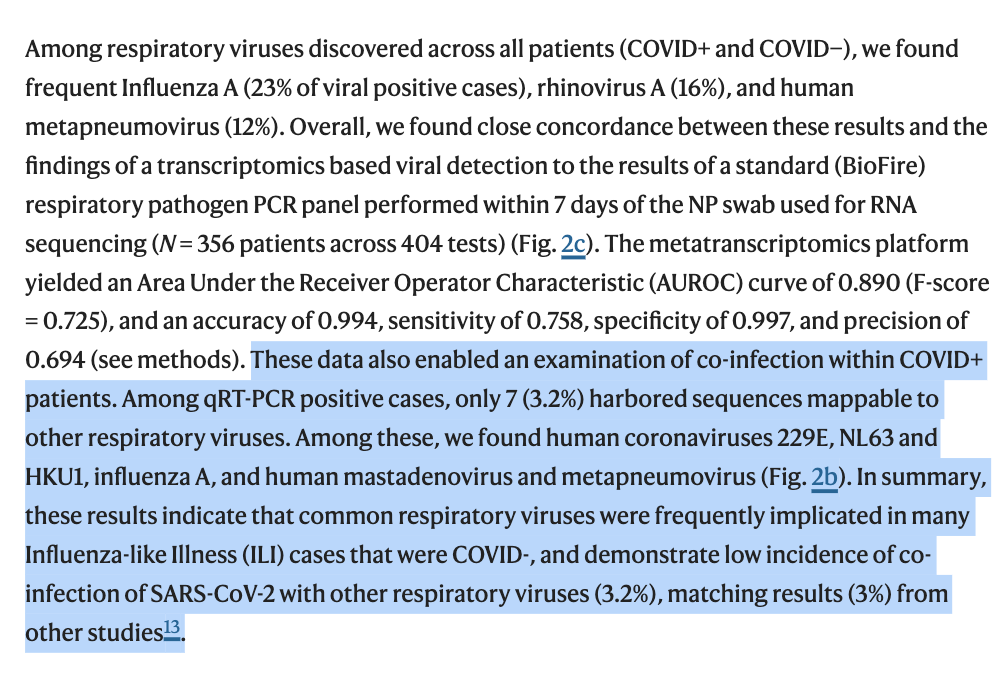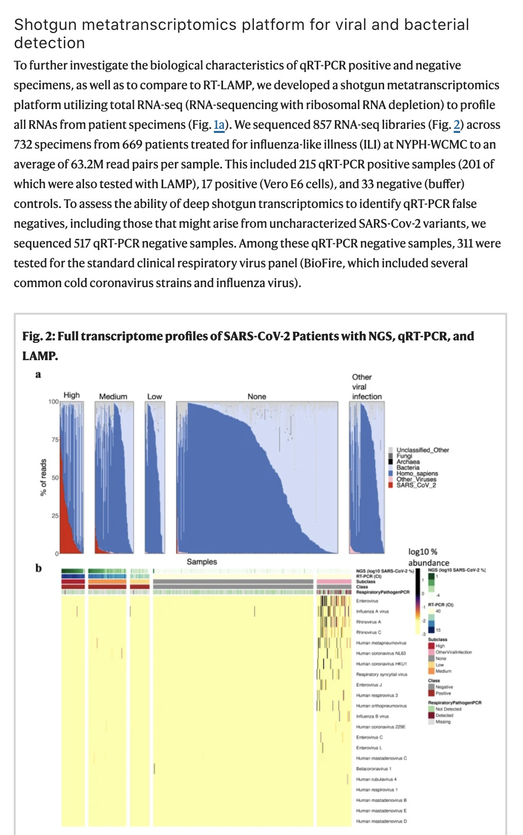 Most notable from this work is that by sequencing all RNA in patient samples, we can shed light on the blame game. Many people like to claim C19 is just a passenger and something else is causing illness. But that something else has no RNA signatures in Butler et al. Only 3.2% of the samples had co-infection with other RNA based viruses and in many patients the C19 RNA was the dominant RNA in the sample, even more prevalent than host cell RNA!!! This is consistent with Kim et al and Long at el.