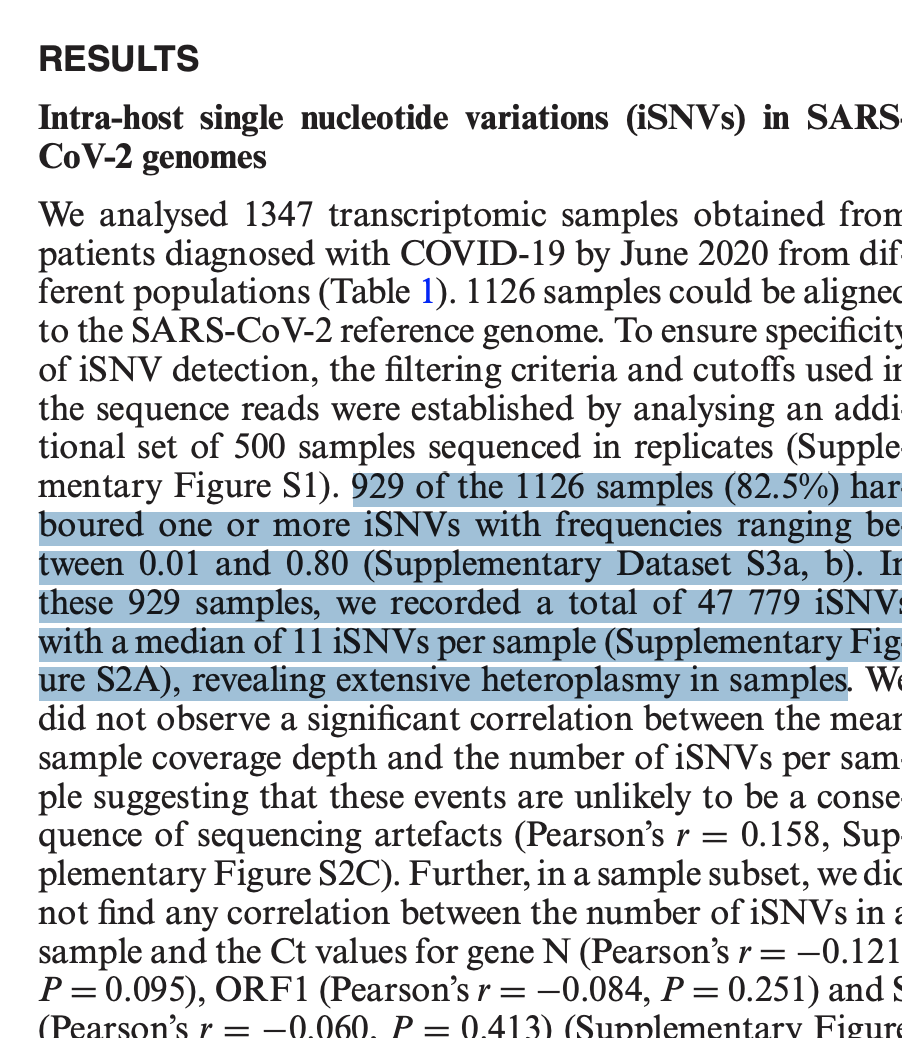 Another paper that attempts to dive deeper into low frequency variants (heteroplasmies) is Pathak et al. They are likely approaching the error of the cDNA synthesis step (1:50K). Even at these very rare allele frequencies they are only finding 11 strains per patient. I think this paper is likely conflating RT/cDNA synthesis errors with real APOBEC generated SNPs in the virus. Perhaps 1:1000 allele frequencies would be a more conservative frequency to measure as it would be well above the error floor of the sequencing reads derived from RT polymerases used for cDNA synthesis. I suspect this filtering would demonstrate 1-2 strains above the 0.1% frequency.