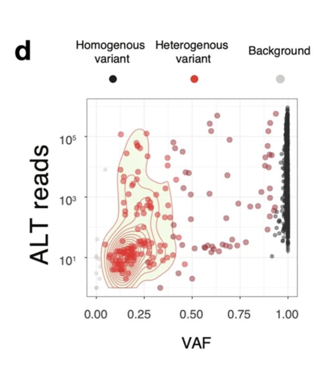 A close up on this swarm is seen in Figure 3d. Many variants are homoplastic (homogeneous meaning all RNA strands share the mutation) and a few are heterogeneous (Heteroplasmies where a fraction of the reads have the variant) with allele frequencies in the 5-95% range.