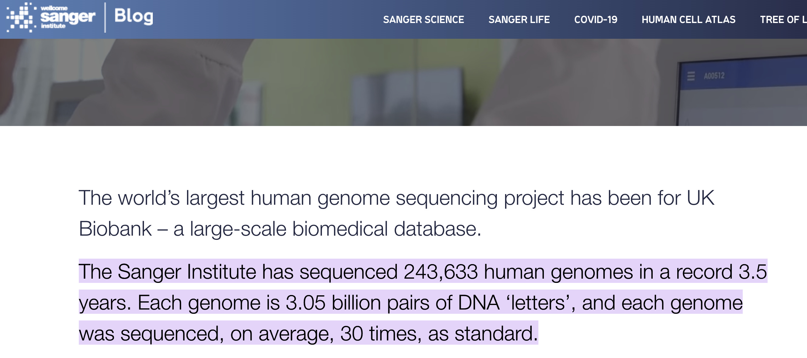 A few other comments on JJs cast. About an 1:41 minutes in he seems surprised the sequencing community is gunning to sequence a millions genomes. I hate to be the bearer of bad news but this has already happened. Just a single genome center sequenced a ~250K human genomes in 3.5 years. They don’t need the pandemic sample collection to achieve this end.