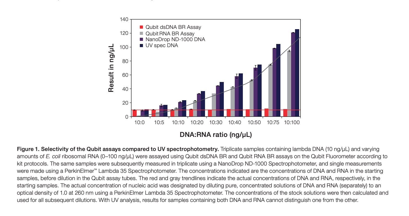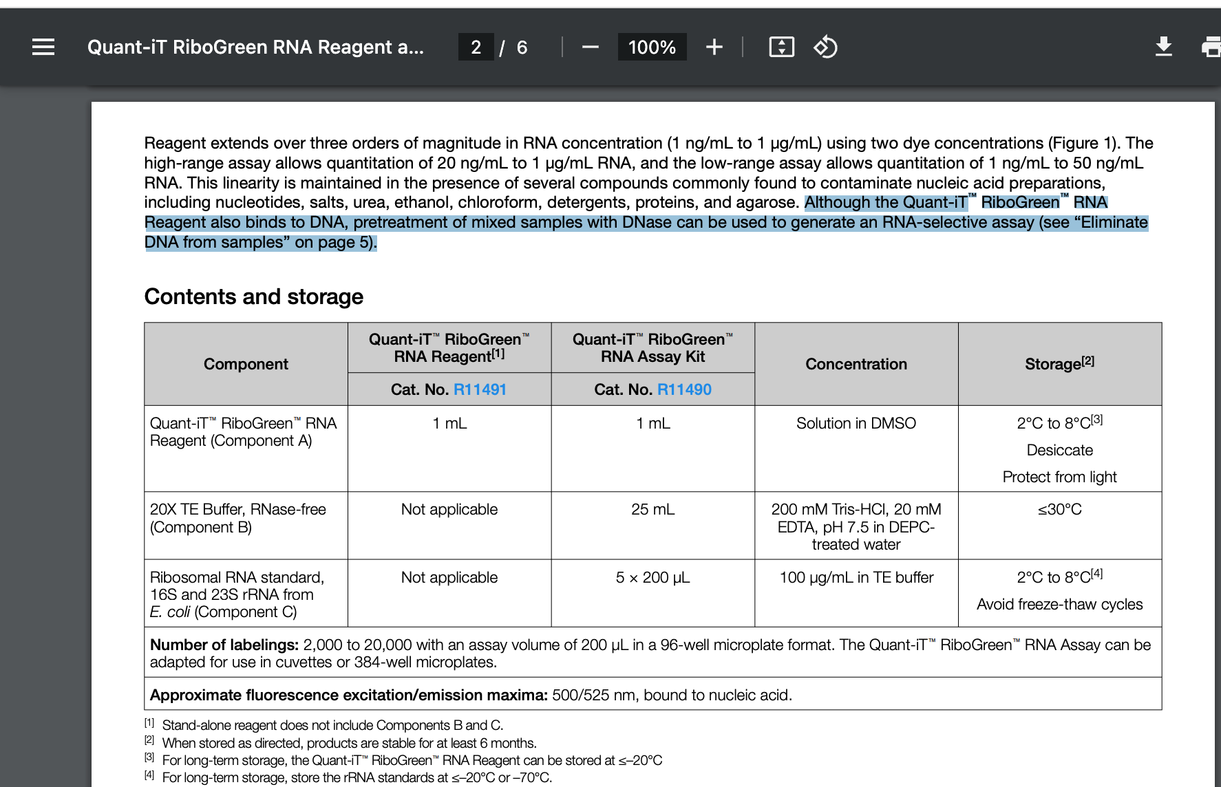This is where the authors make one flaw. They resort to Thermo’s marketing material on this kit regarding PicoGreens specificity for DNA over RNA staining. I used to work at Life Tech in the genetic analysis department that made this technology so I know the reason the chart in this marketing material is not appropriate for this use case.