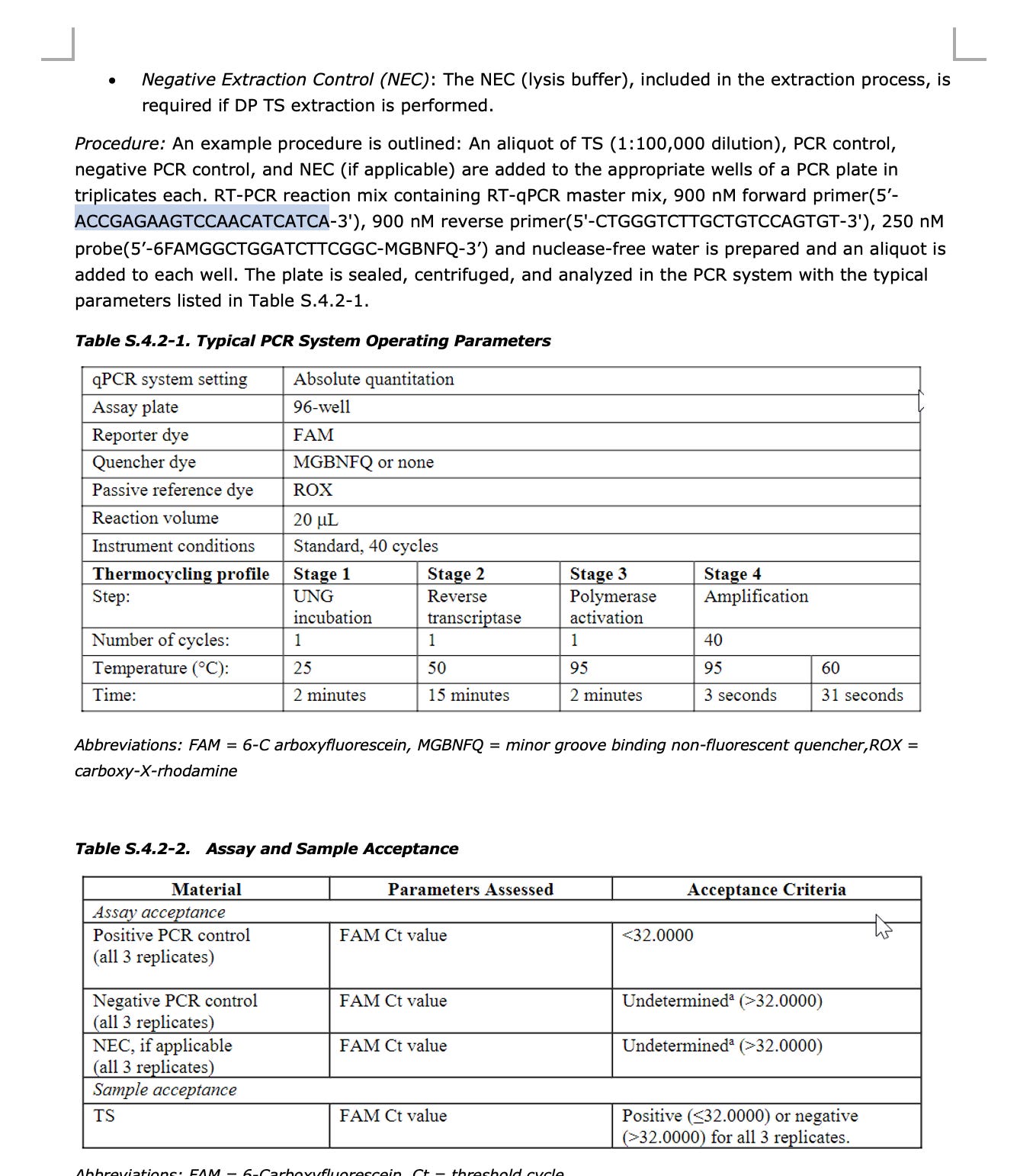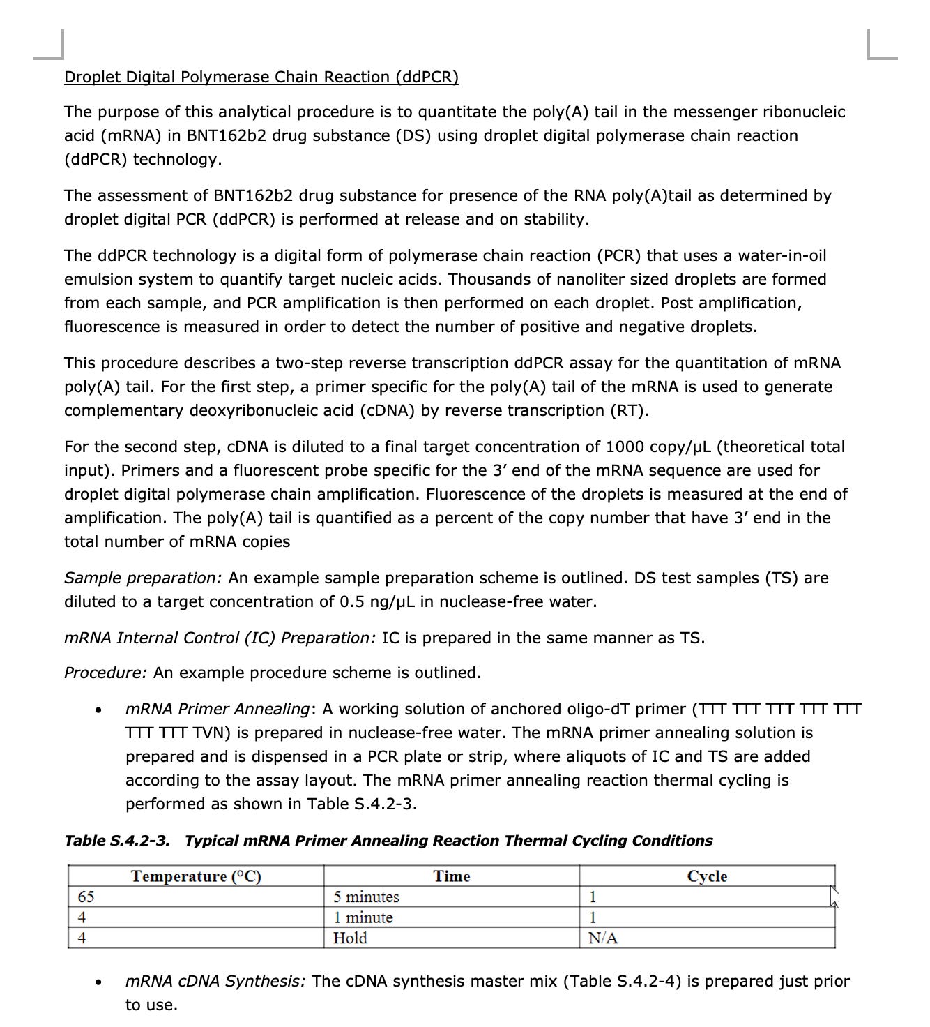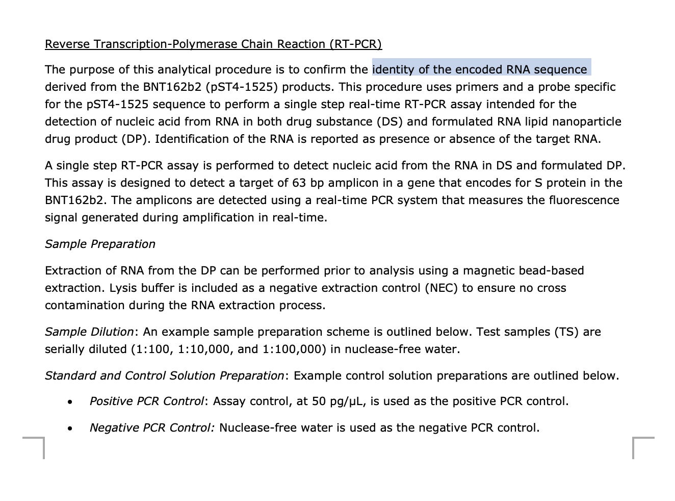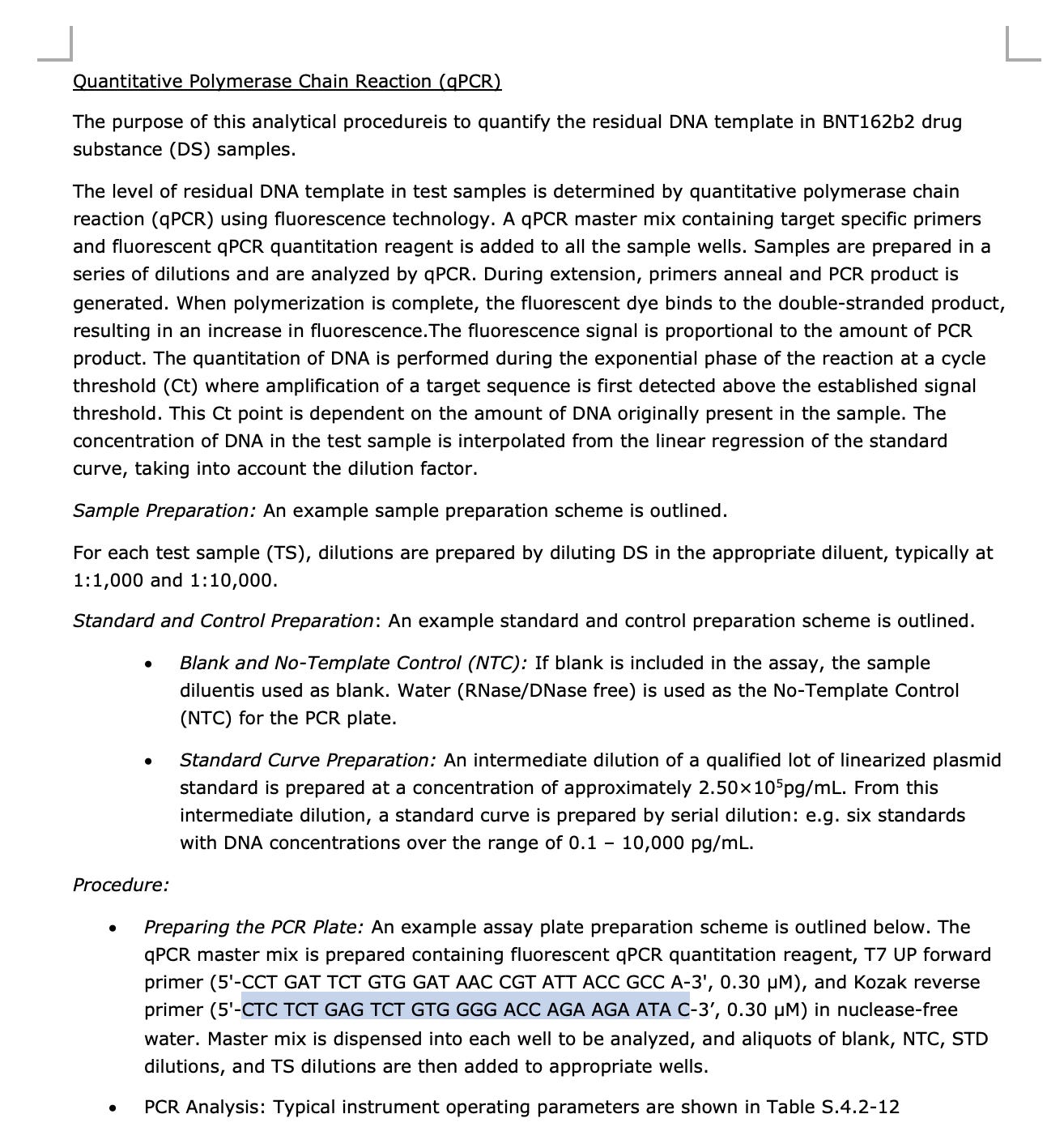 Note, there are 2 other primer sets described in the EMA documents. One Primer set lands on Spike and is used as an RT-qPCR assay to identify the mRNA. It is a quantitative TaqMan assay. This is a very important point as it shows they had a qPCR primer set that could quantitate RNA but chose to NOT use it and instead reflex to Fluorometry for RNA quantitation. This is NOT the primer set used to quantitate the DNA with qPCR. Those primers are shown above.